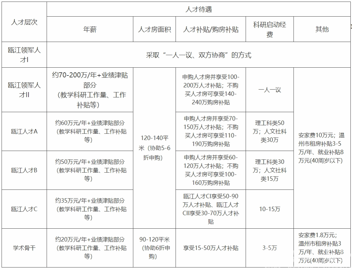 人才引进基本条件:具备较高的思想政治素质和职业素质,热爱教育事业,遵守法律法规及学校规章制度,身心健康,爱岗敬业,治学严谨,具有良好的道德修养。学校人才引进主要分为五个层次:瓯江领军人才(I-II)、瓯江人才A、瓯江人才B、瓯江人才C(I-II)和学术骨干(I-IV)。