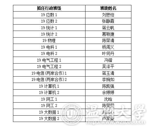 为做好2019级新生工作,帮助新生更好地适应大学的学习和生活,加强学风、班风建设,充分发挥大学生“自我管理、自我教育、自我服务、自我监督”的作用,经学生本人自愿申请,学院考核,拟推荐刘思怡等17位同学为2019级新生班主任助理,现将名单予以公示。