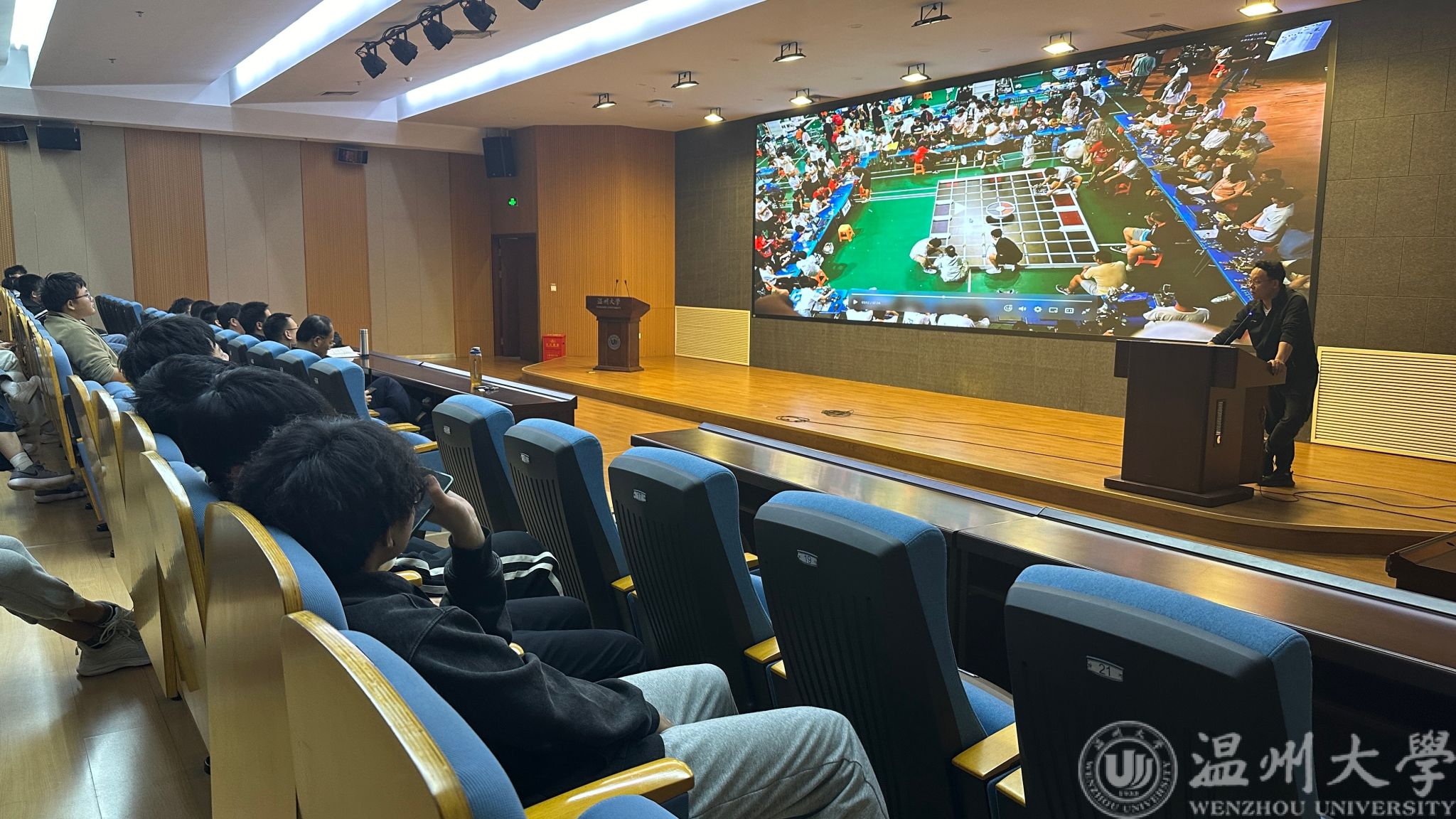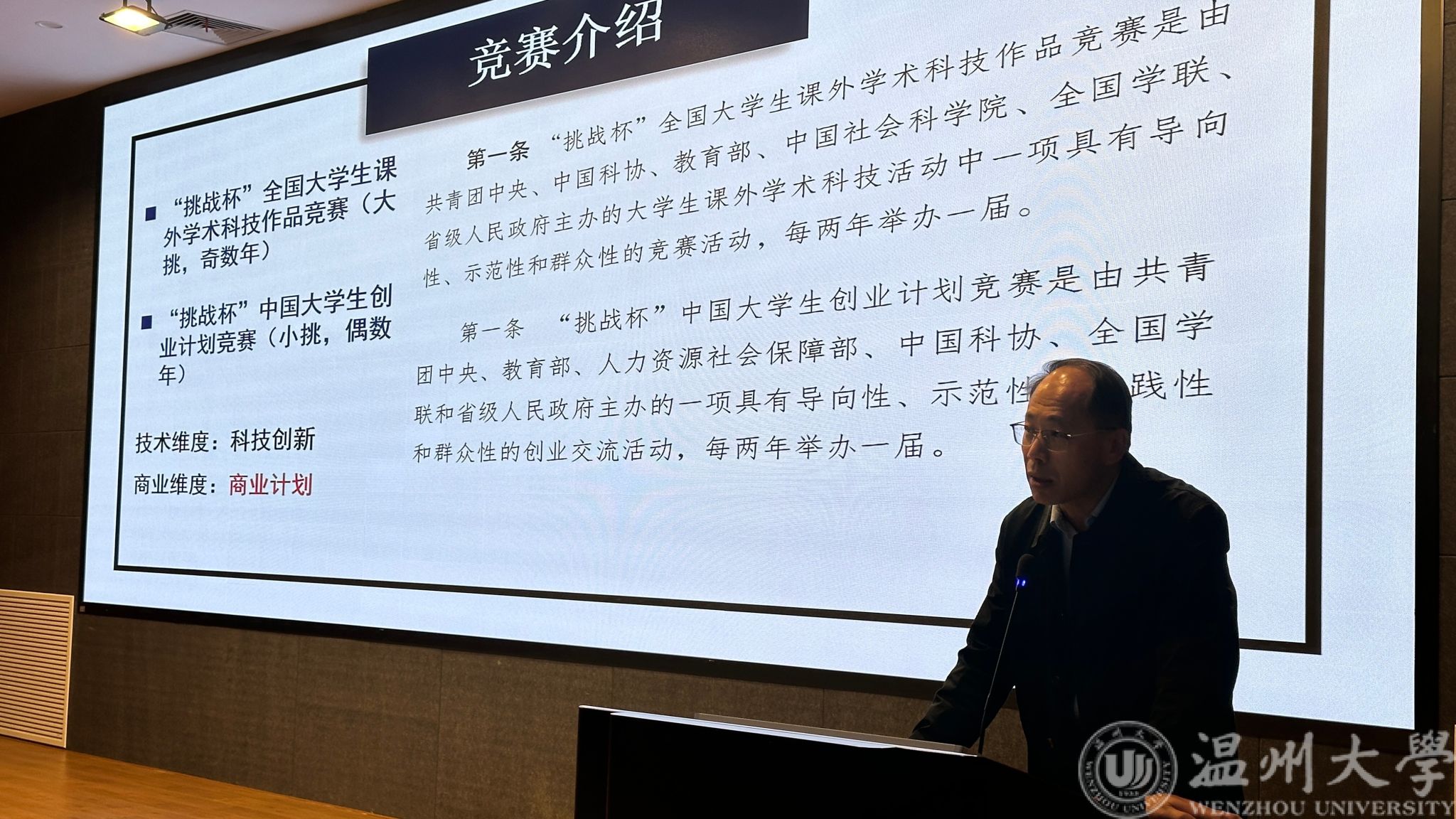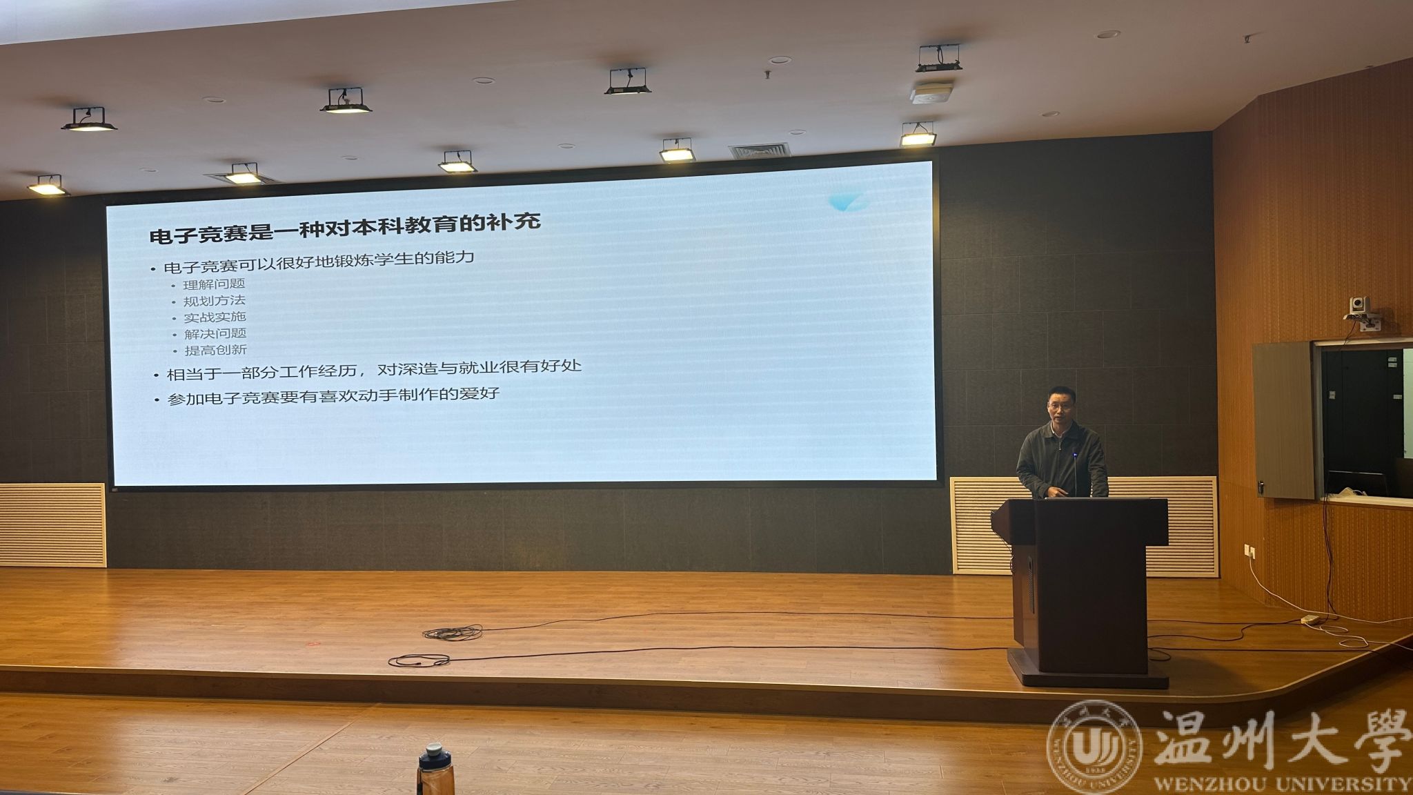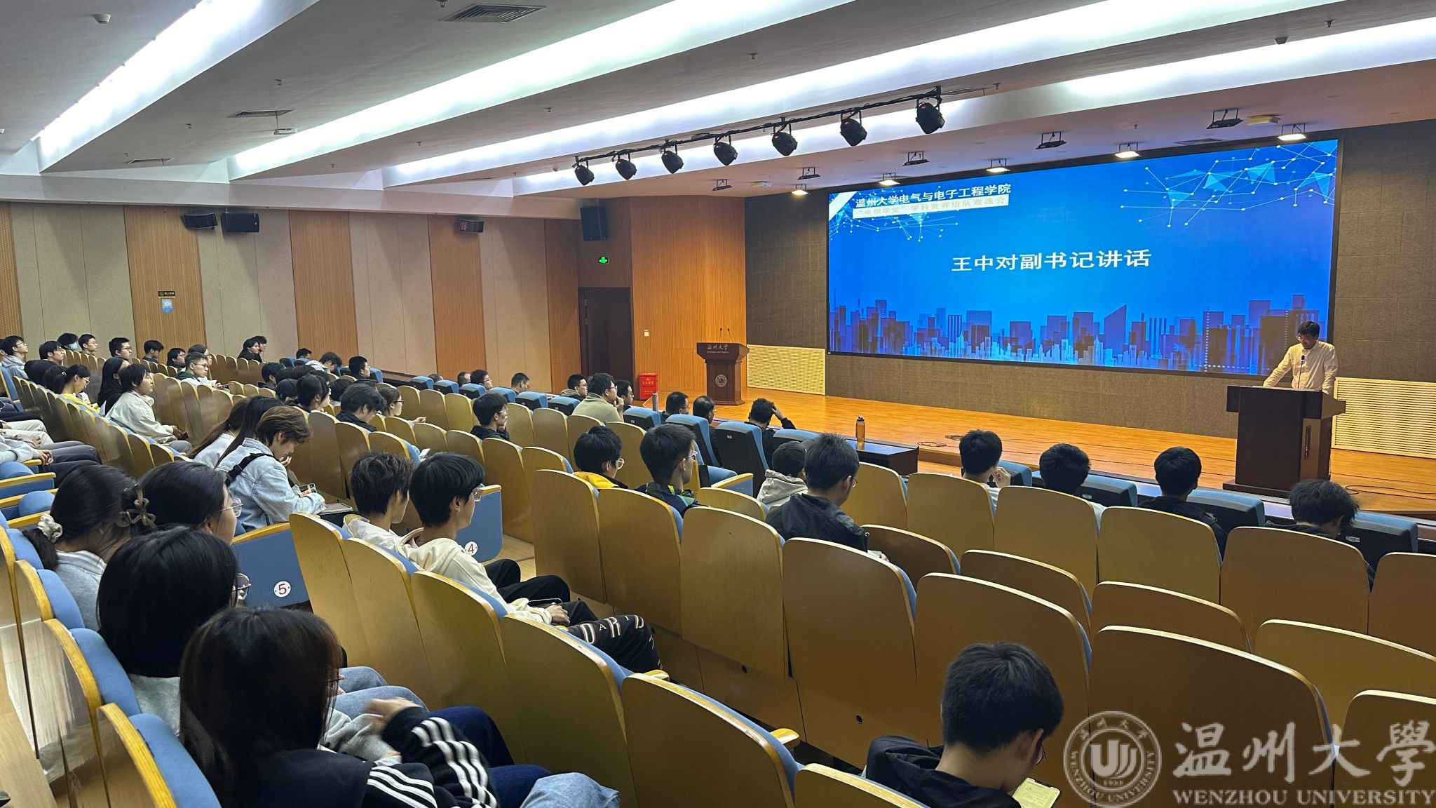 会议伊始,王中对副书记发表动员讲话,他向与会人员讲述了组建学院“电创学堂”的初衷与愿景:在本次会议召开之前,特别在学院里募集致力于指导大学生学科竞赛的教师,组建“金牌导师团”,通过开办“电创学堂”,在大学生日常课程之外,开辟出专注于大学生学科竞赛的第二课堂,培养学生的专业知识和动手能力,把课堂上学到的专业知识,运用到具体实践中去,激发同学们的创新精神和实践能力。随后,与会导师逐一亮相,他们分别是指导学院相关学科竞赛领域的重要人物,第一位导师,电气系主任吴平教授,深入浅出地讲解了“挑战杯”全国大学生课外学术科技作品竞赛和“挑战杯”全国大学生创业计划竞赛的核心理念,鼓励学生们投身科学探索,追求卓越。紧接着,由吴自然副教授、陈冲副教授、王环高级实验室先后介绍了中国国际大学生创新大赛、大学生电子设计竞赛、大学生机器人竞赛和大学生智能车竞赛,他们各自精彩的介绍不仅展示了比赛的独特魅力,也让在场学生对未来的参赛之路充满了无限遐想,最后登场的是金牌导师团的其他指导老师们,他们详细介绍了自己的研究领域和拟带领的竞赛方向,无论是人工智能的前沿探索,还是电气工程的精湛技艺,亦或是电子科技的创新设计,每位老师的分享,让学生们心中那份对未知的好奇与渴望愈发强烈。