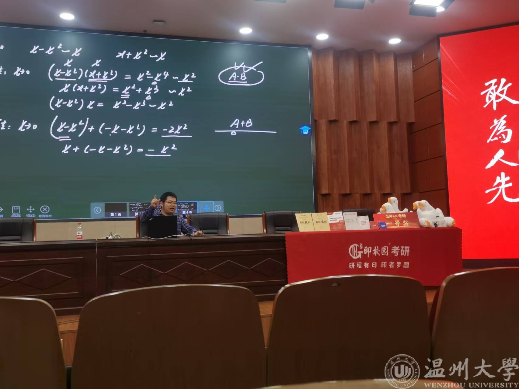 为了营造良好的考研氛围,帮助广大学子科学备战考研数学,2024年11月6日晚上,我院在南校区岩松堂雁山厅举行“考研数学备考规划高分指导”讲座。本次讲座有幸邀请到了来自浙江大学的博士、资深考研数学辅导专家杨建山老师作为主讲嘉宾。活动吸引了我院众多大三学生以及其他有意向参加考研的同学前来聆听。