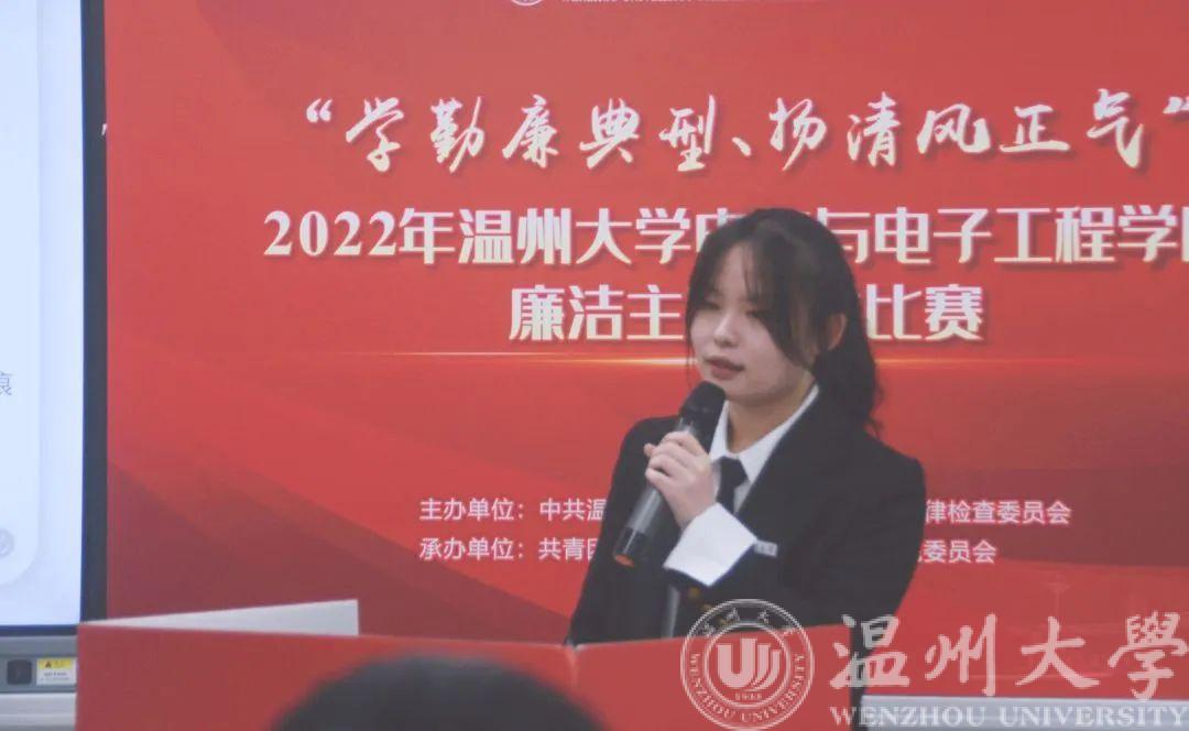 为深入学习贯彻党的二十大精神,持续推动党史学习教育走深走实,引导广大学生学习老一辈革命家、优秀共产党员艰苦奋斗、清正廉洁的品格,助推“清廉温大”建设,我院于2022年11月23日晚在南校1A-203举行第三届“学勤廉典型,扬清正风气”主题演讲比赛。本次比赛由学院党委副书记曾蓓蕾、学院学工办辅导员潘龙飞、余明新、陈海彤、屠昌浩老师担任评委。程佳聪同学主持,各班代表现场参与此次活动,2022级全体新生线上观看了比赛。