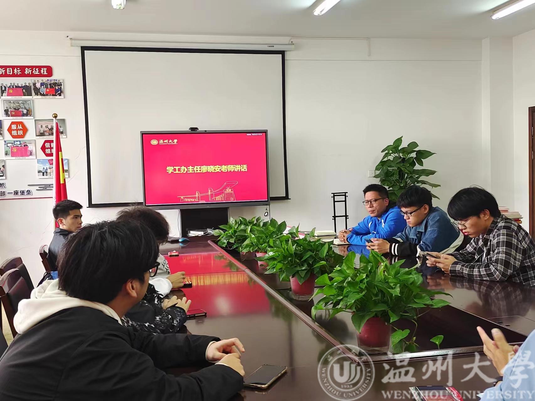 随后学工办主任廖晓安老师就学院纪检工作及纪检委员职责提出相关要求,并强调了班级学风建设问题。