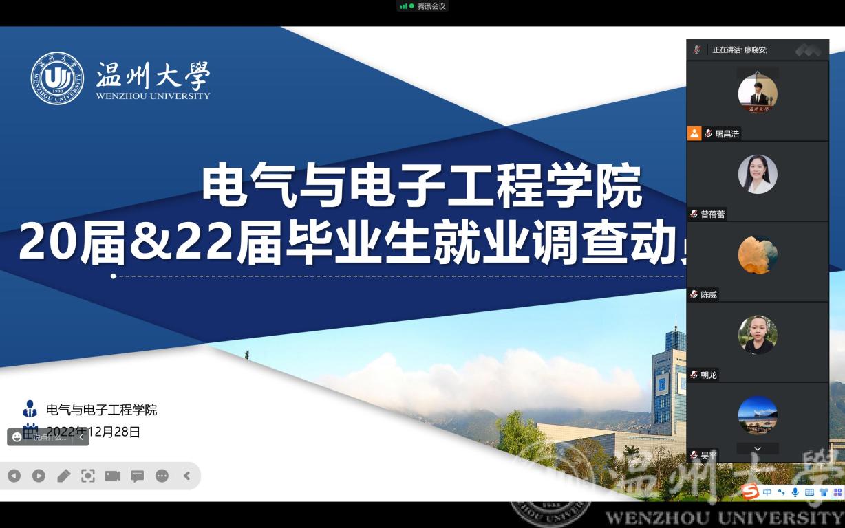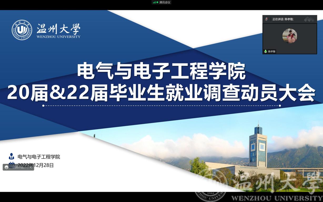 12月28日下午2:00,我院召开20届与22届毕业生就业调查动员大会线上会议。副院长陈孝敬、党委副书记曾蓓蕾、电气系主任吴平、电子系主任庄友谊、学工办主任廖晓安以及20届与22届各毕业班班主任参会,会议由学工办就业辅导员屠昌浩主持。