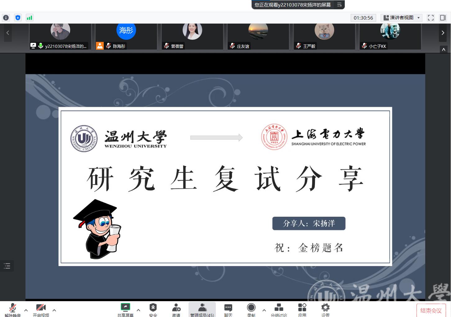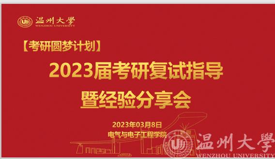 电气电子学院高度关注学生考研工作,精准统计学生报考院校及成绩情况,针对学生情况进行分类指导、跟踪服务。在2月28日至3月4日期间组织了温州大学、浙江大学、上海电力大学以及杭州电子科技大学的复试指导和经验交流会,强化考研复试指导服务,让同学们在复试时能够从容发挥,顺利上岸!