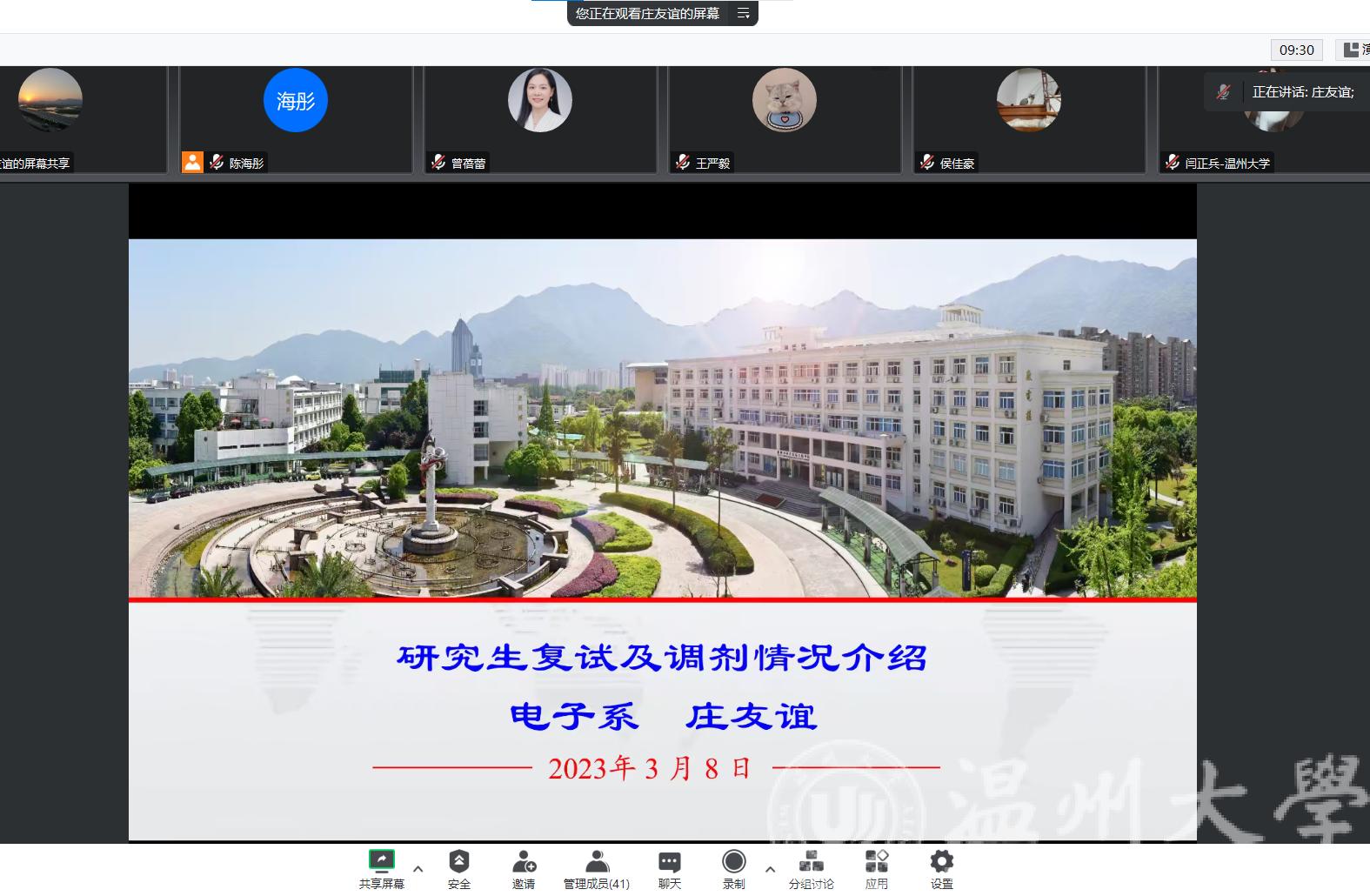 为进一步帮助我院2023届考研学子掌握复试技巧及调剂方法,增强复试信心,3月8日晚上18:30,我院召开2023年考研复试指导暨经验分享的线上会议。学院党委副书记曾蓓蕾、学院挂职副院长张鉴,电子系主任庄友谊、电气系专业老师闫正兵,2019级辅导员潘龙飞,考取浙江大学、上海电力大学等高校的三位往届优秀校友,以及2023届考研学子出席本次交流会。会议由学工办辅导员陈海彤主持。