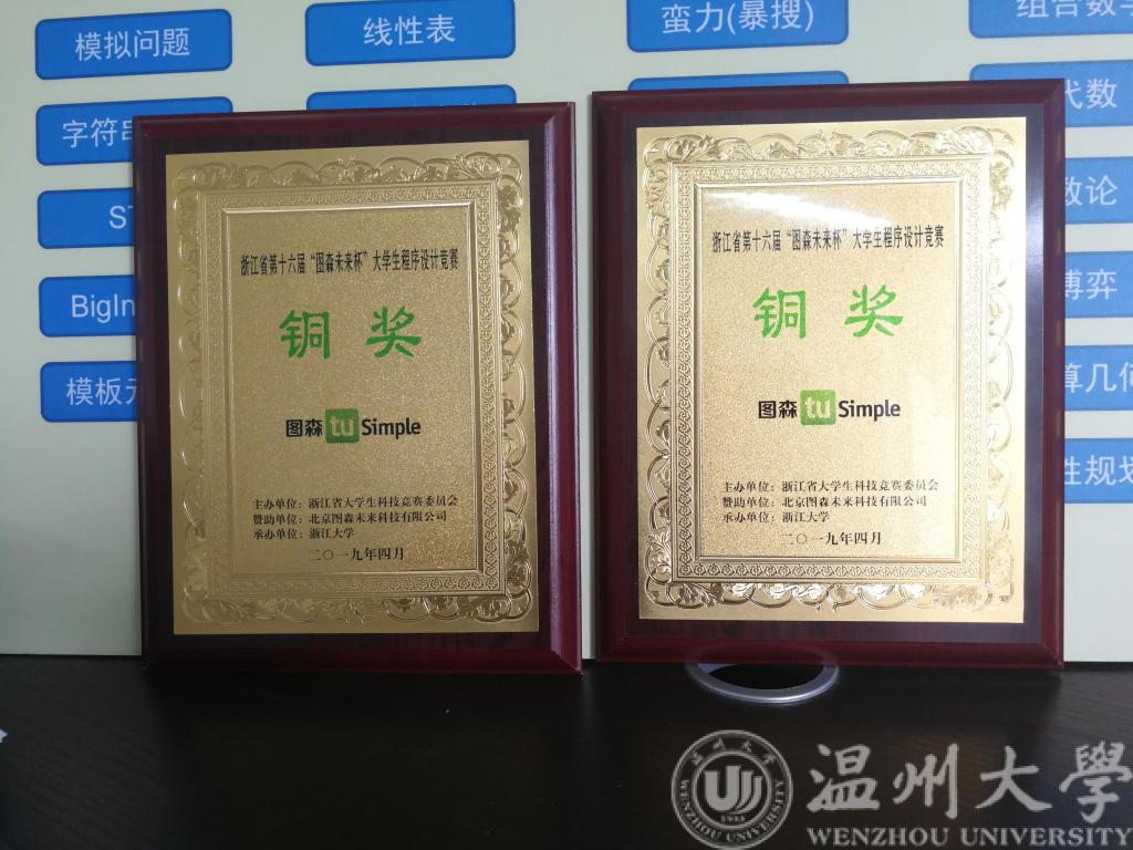 4月27日,浙江省第十六届大学生程序设计竞赛(ACM省赛)在浙江大学紫金港校区举行,温州大学荣获两项铜奖,分别由贝塔队(队员:16电信2班王文轩、17网工2班王鑫宇和吴江宏)和阿尔法队(队员:16计本1班钟庭彪、李克炼和孙铤超)获得。