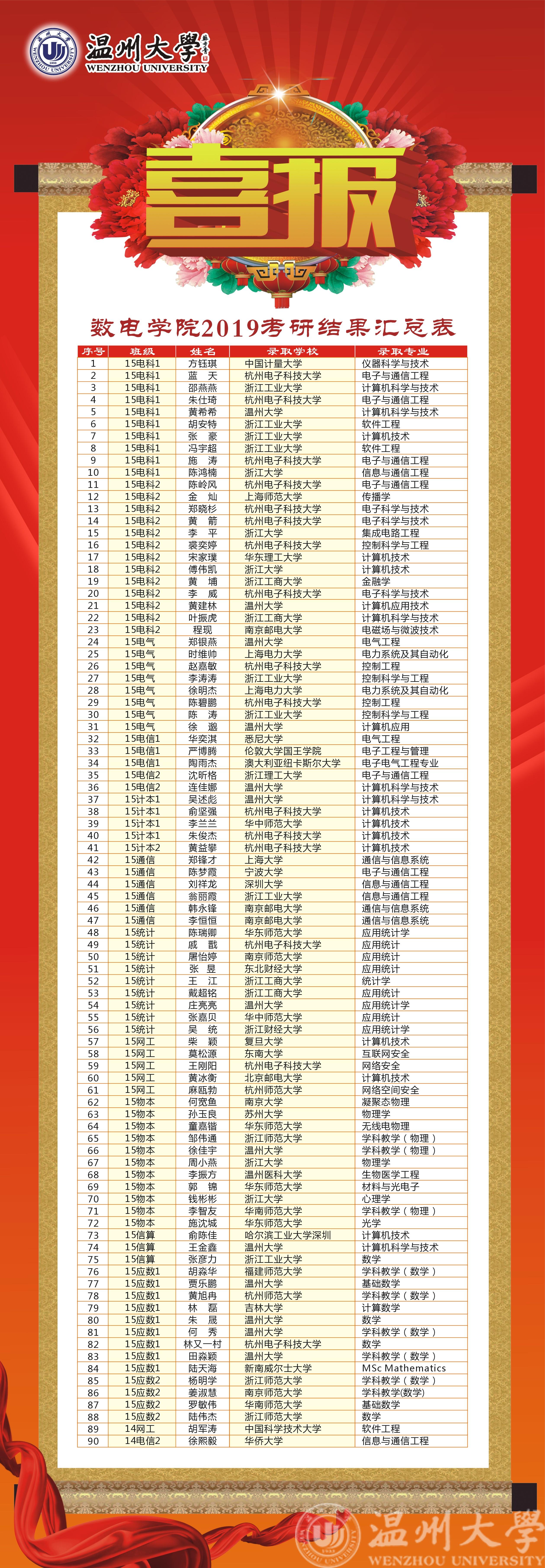 在我院学子不懈奋斗中和全院老师的关心、指导下,2019届毕业生在研究生入学考试中,共有88人成功考取了浙江大学、复旦大学、南京大学、东南大学等国内外知名院校研究生,录取率突破14.5%。在此全院师生共同祝贺同学们取得的优异成绩,并预祝他们在今后的求学路上再创辉煌!