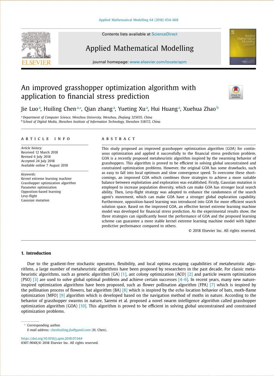 1、Jie luo, Huiling Chen, et al.: An improved grasshopper optimization algorithm with application to financial stress prediction, Applied Mathematical Modelling, 64 (2018) 654–668.(SCI一区)