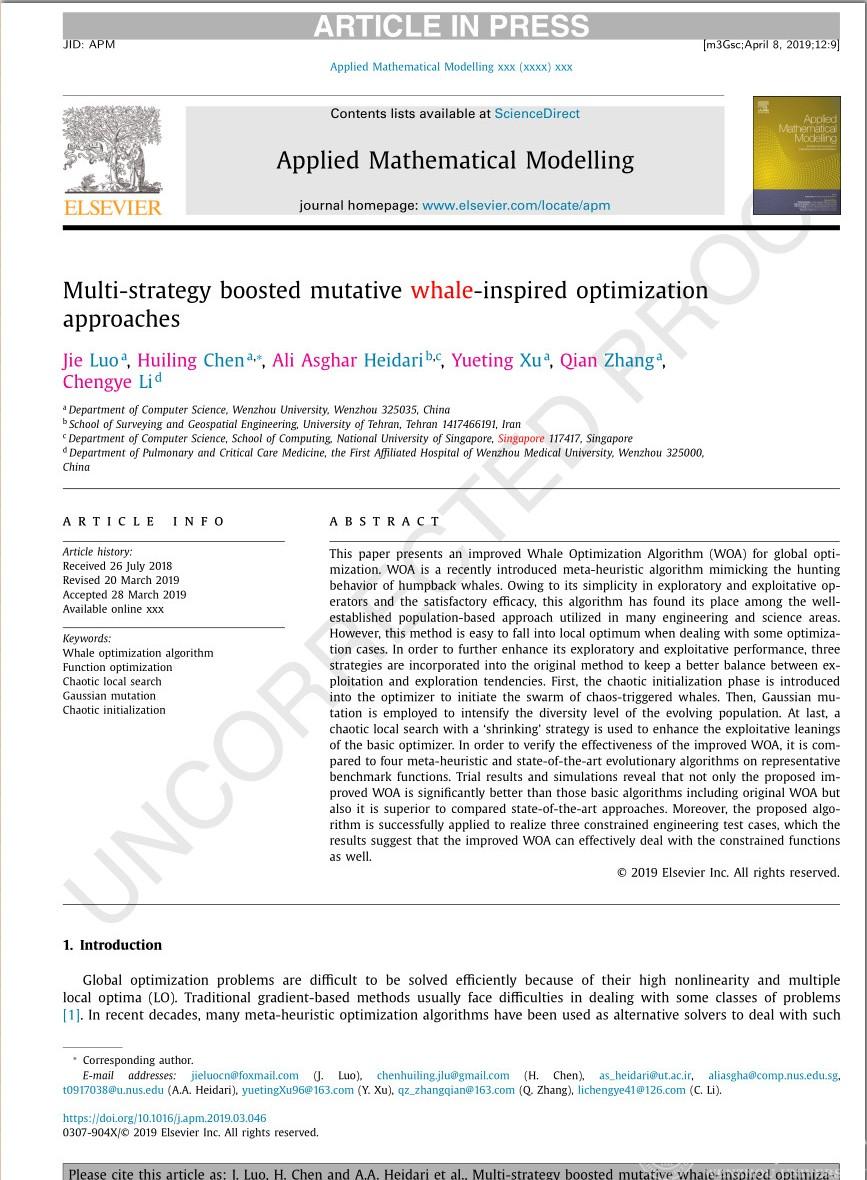 2、Jie luo, Huiling Chen, et al. Multi-strategy Boosted Mutative Whale-inspired Optimization Approaches. Applied Mathematical Modelling, 2019.(SCI一区)