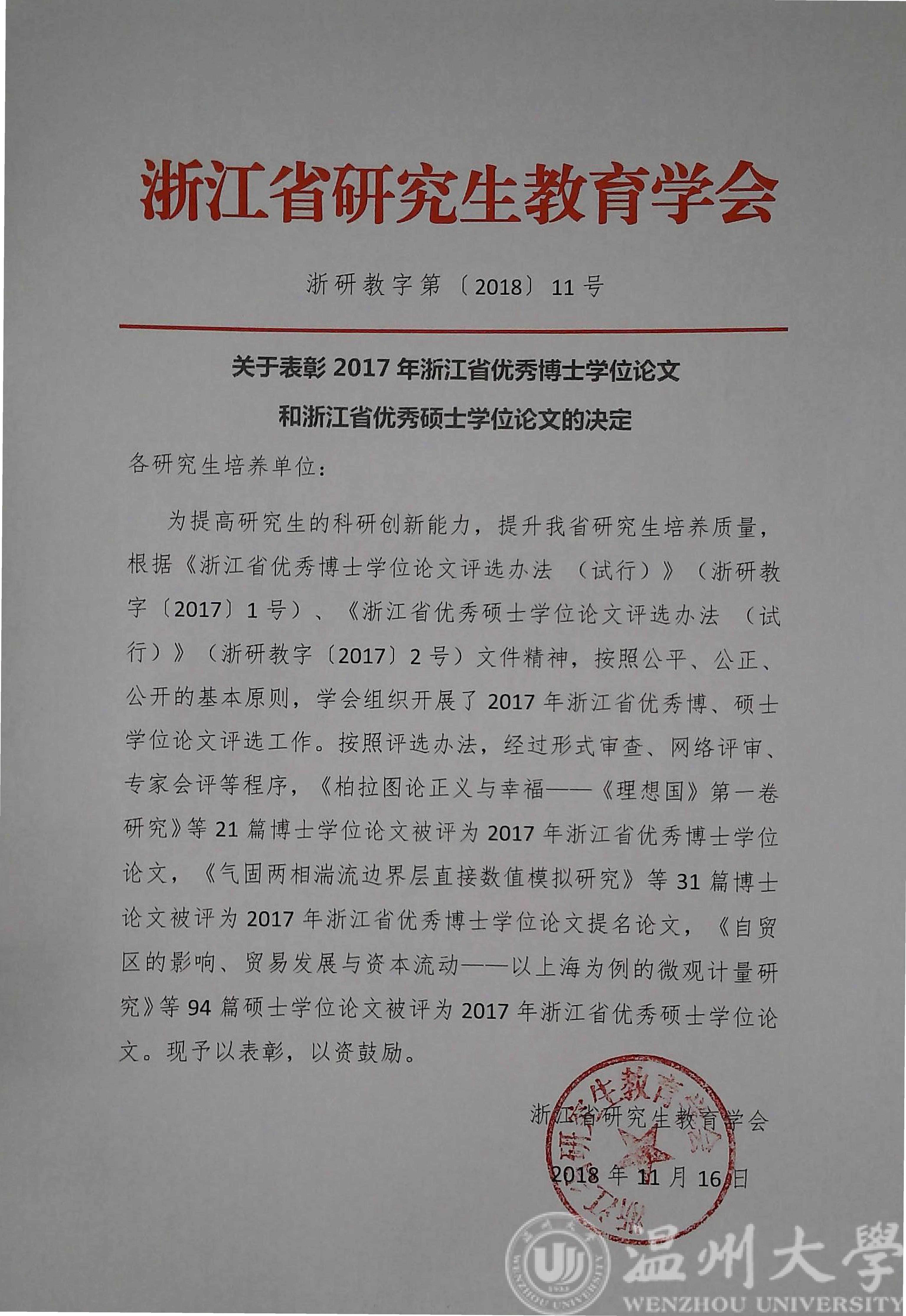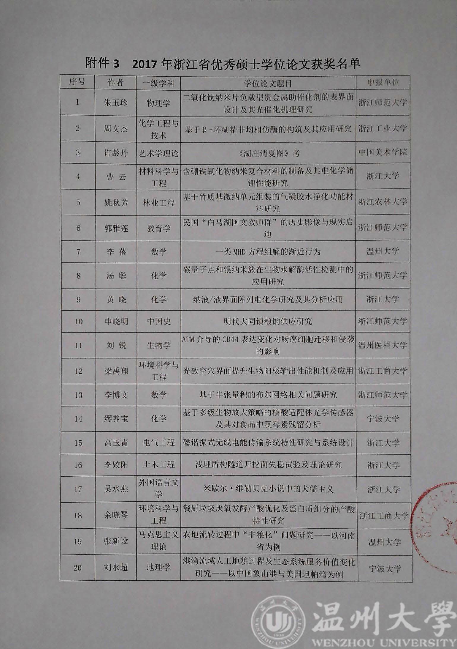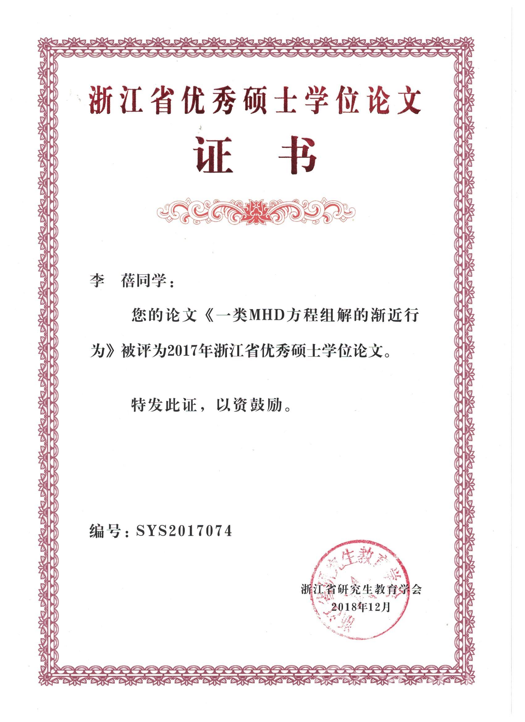 温州大学数电学院2014级研究生李蓓(导师:赵才地教授)硕士学位论文《一类MHD方程组解的渐近行为》被评为2017年浙江省优秀硕士论文。