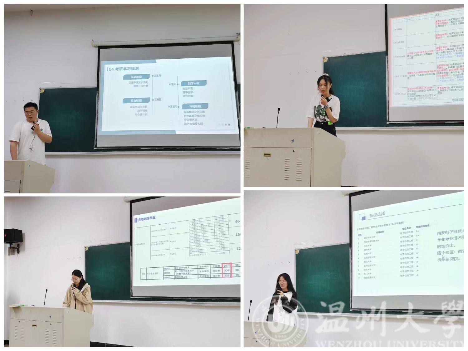 本次交流会由庄友谊老师主持,庄老师首先简要介绍今年电子系19级本科生考研情况,并介绍了温州大学本校考研升学的奖励政策,希望同学们结合自身学习特点在院校选择以及学硕/专硕选择上慎重考虑,鼓励同学们报考温大本校、本专业的研究生。