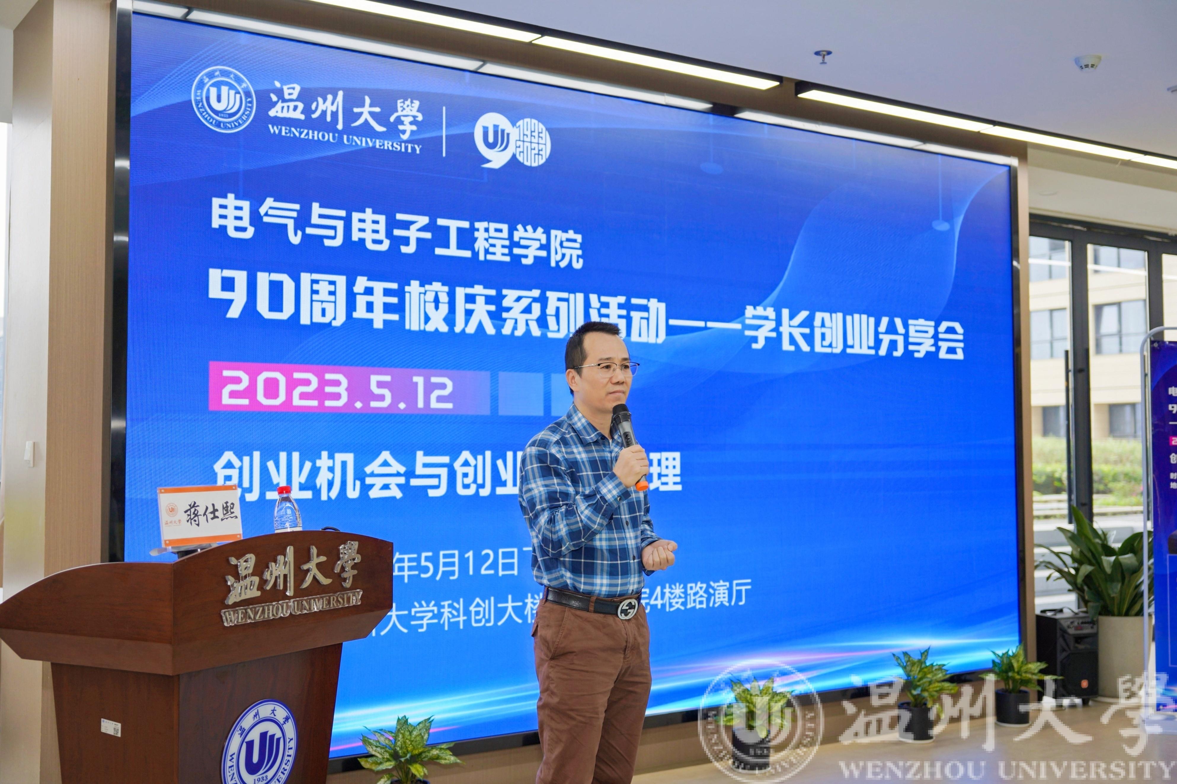 仪式结束后,蒋仕熙校友进行了“创业机会与创业风险管理”的主题分享。他通过个人经历引出了他的创业故事,并通过华为高管创业失败等详实的案例指出了当下的创业环境已经不如八九十年代,创业风险极大。随后,蒋仕熙校友分享了他认为创业成功应该具备的几个条件:激情、能力和认知,并分别用自身的经历与其他知名商业案例来印证这几个条件,得到了在场嘉宾与同学们的高度认同。最后,他鼓励同学们要努力学习,尊师重道,将来用更大的贡献回馈母校与社会。