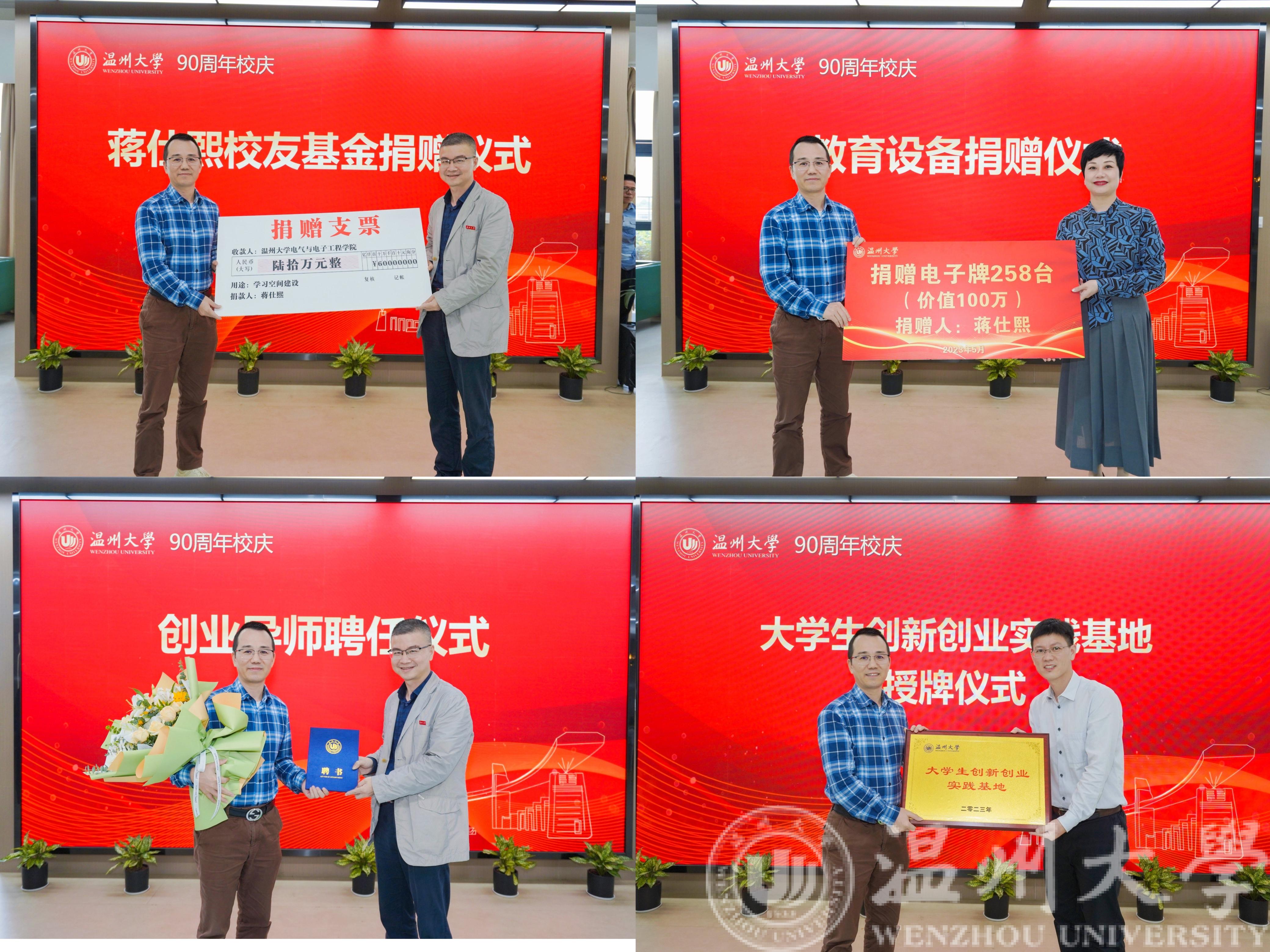 在现场各位嘉宾的共同见证下,蒋仕熙校友与李方强书记和张若妤处长进行了隆重的基金捐赠与教育设备捐赠仪式。与此同时,我院还聘请蒋仕熙校友担任我校创业导师,并授予蒋仕熙校友的企业为我校大学生创新创业实践基地。