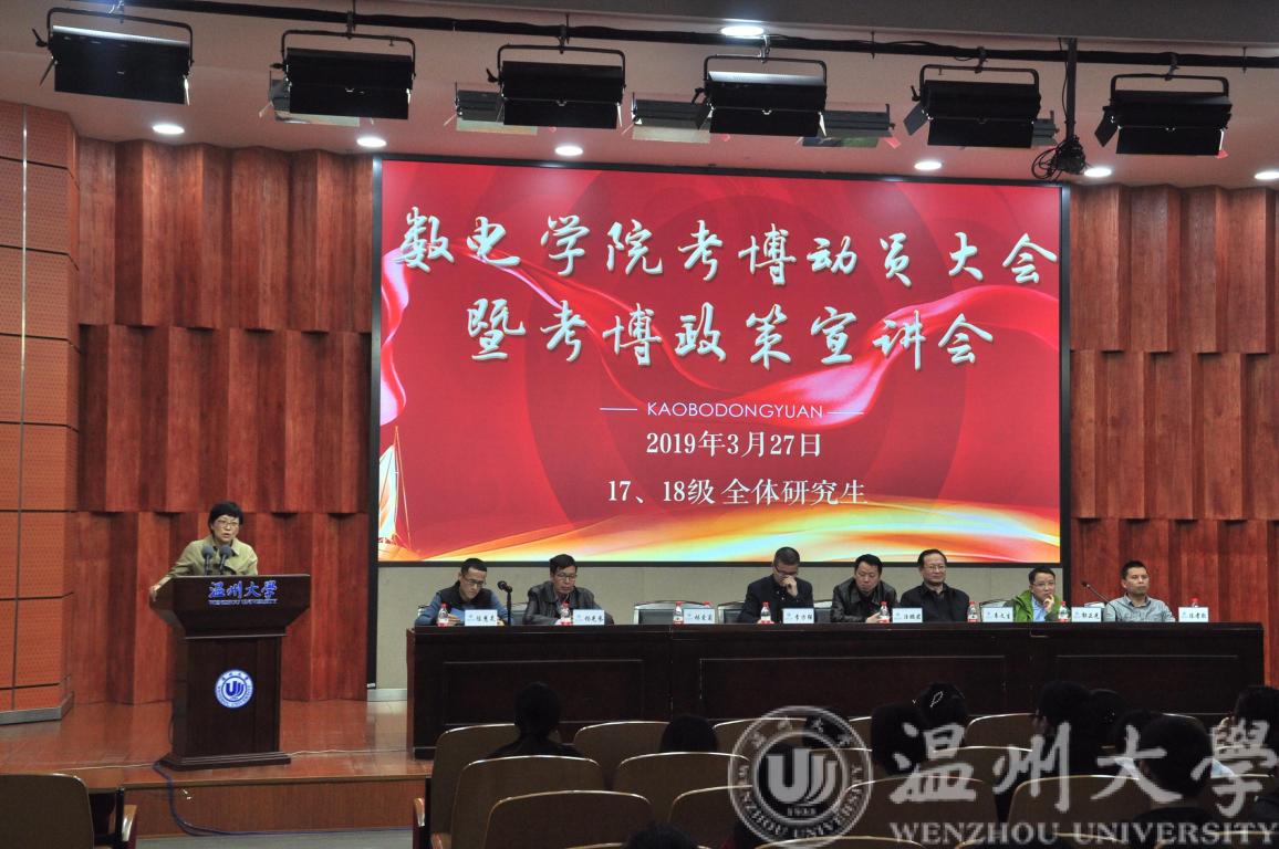 2019年3月27日15点30分,温州大学数电学院在岩松堂雁山厅召开了面向全体17、18级研究生的考博动员大会暨考博政策宣讲会。数电学院院长汪鹏君、党委书记李方强、副院长韦文生、党委副书记林爱菊及各硕士点硕导代表杨光参、郭正光、陈慧灵、陈孝敬共同出席了本次动员大会,本次会议由林爱菊书记主持。