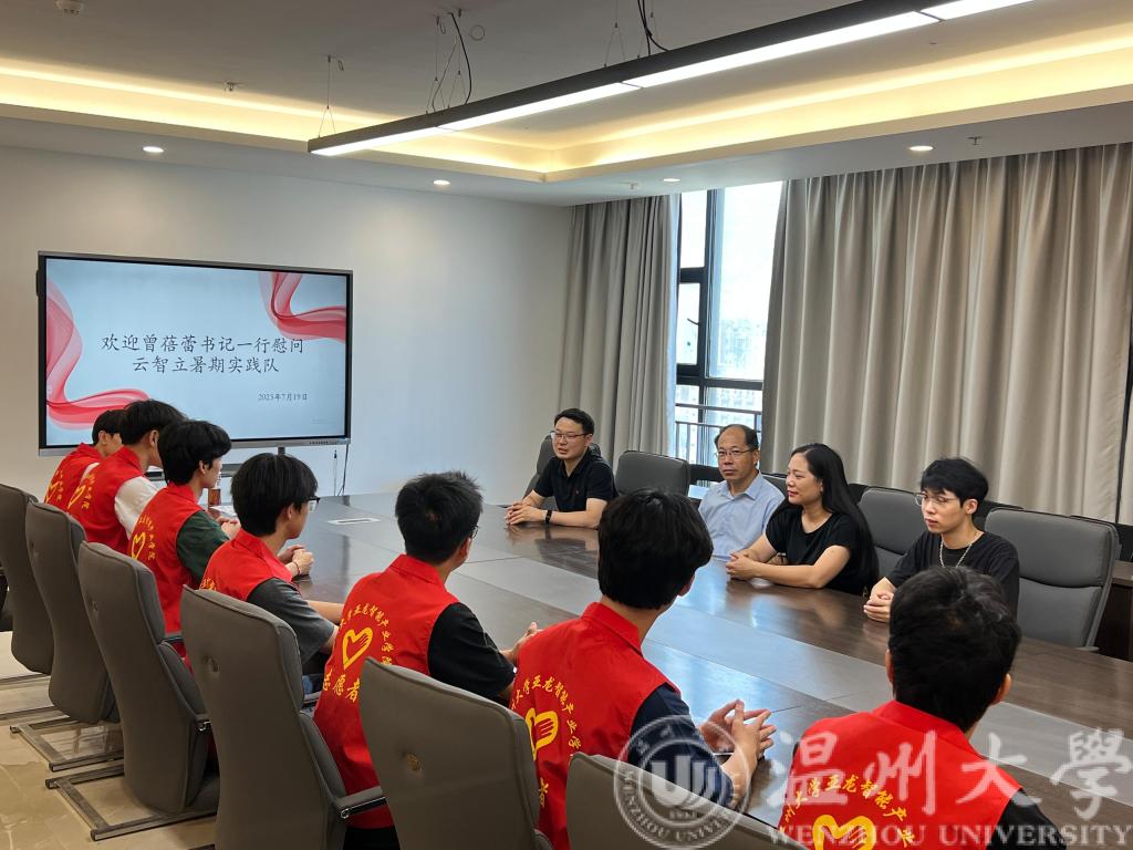 7月19日上午,学院党委副书记曾蓓蕾一行来到温州大学科技综合大楼九楼慰问学院正在进行社会实践的云智立暑期科创实践团队,学院辅导员潘龙飞和屠昌浩一起参加了慰问。温州大学云智立科创实践队指导老师吴平热情接待了曾蓓蕾副书记一行。