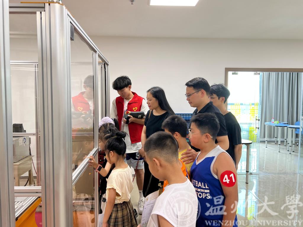 上午9:30左右,温州大学云智立暑期科创实践团队迎来了30余位参加科研活动的小朋友,他们对高科技的设备、VR展示厅与机器人项目等产生了浓厚的兴趣。云智立科创实践团队的队员们,身穿红马甲,亲切友好的向孩子们展示和演示机器设备。曾蓓蕾副书记一行参观了VR展厅、机器人小车、AI视觉分拣系统、工业机械臂等科普项目,了解了实践队智能制造公益活动的基本情况。