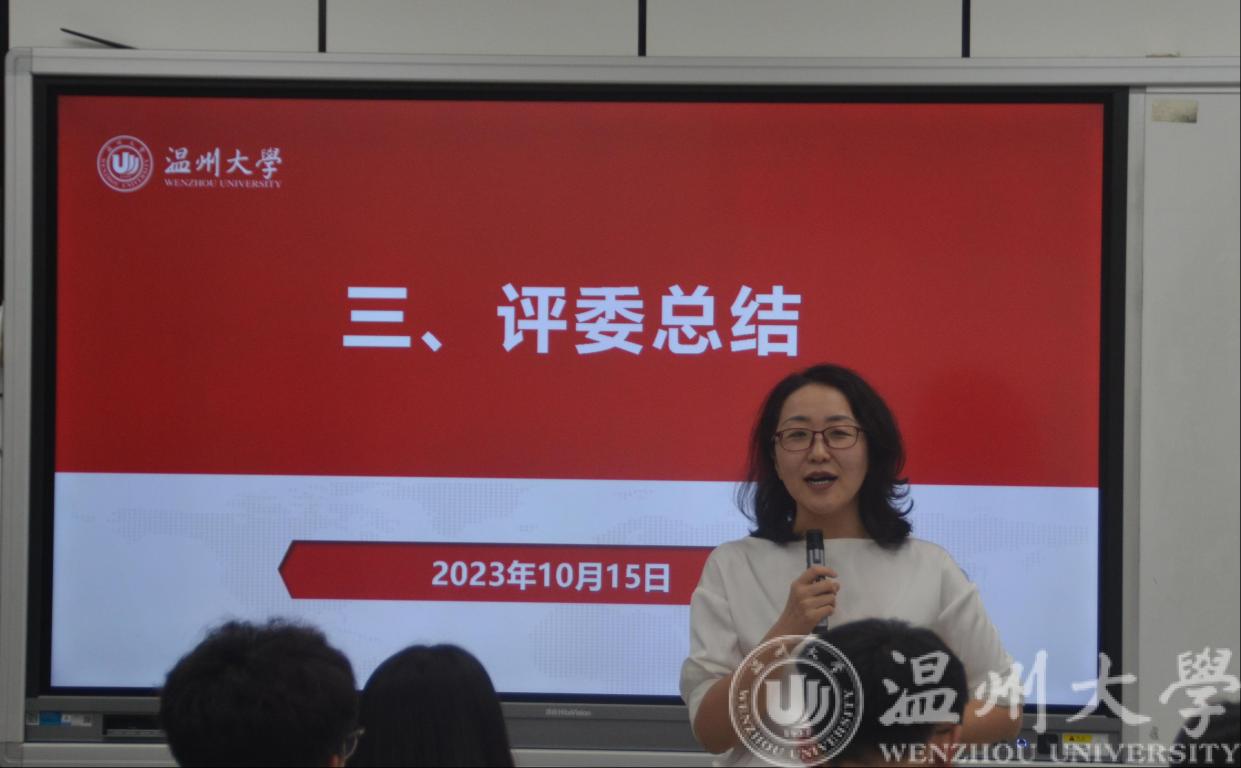 所有选手展示完毕后,朱丽莉老师作为评委代表总结发言。她赞扬了我院大一新生踊跃参赛的热情,并建议同学们不要拘泥于模板,既要仰望星空,又要脚踏实地:首先,同学们的职业规划要能结合经济社会发展的需要,要有情怀;其次,同学们对目标职业要有充分的了解;最后,职业规划大赛作为一项比赛,同学们要注重一些外在的要素,例如着装、PPT等。