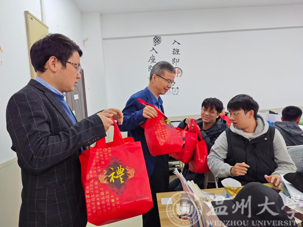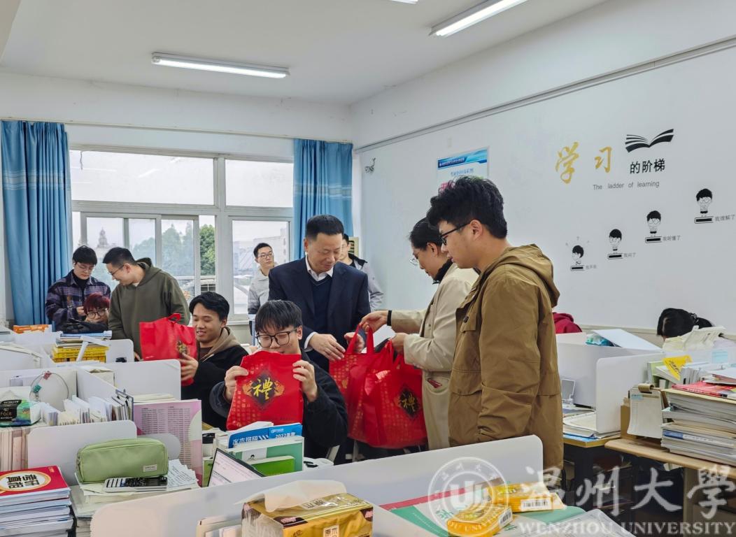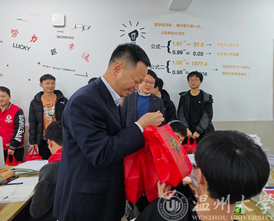 11月30日下午14:00,学院院长汪鹏君、党委书记李方强、党委副书记曾蓓蕾及学工办辅导员们来到学院318考研自习室,为正在备考的考研学子送上学院精心准备的“冲刺大礼包”。