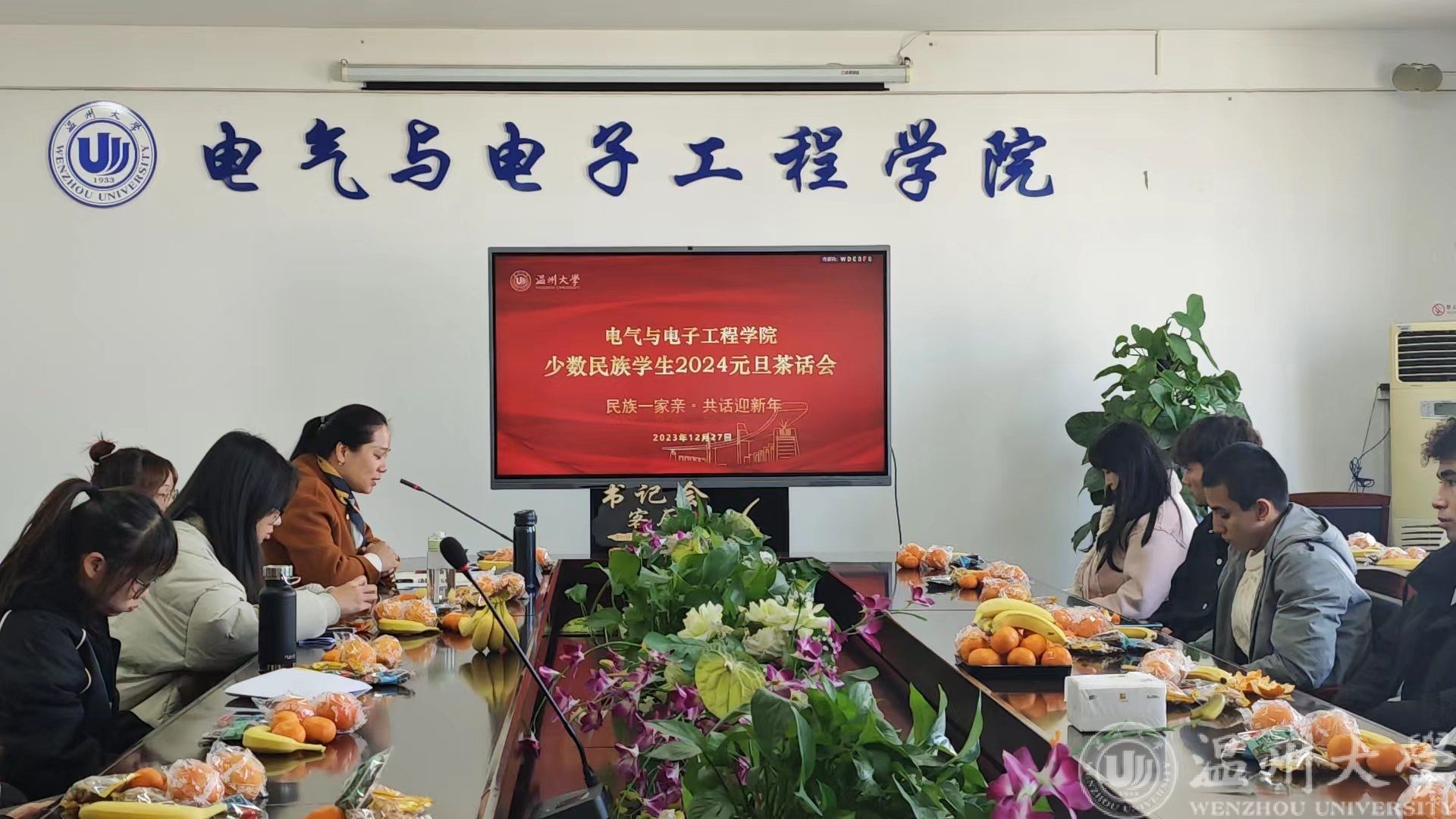 元旦将至,为增进各民族学生的交流,弘扬多元民族文化,增强同学们对中华优秀传统文化的认同,12月27日下午14:00,我院幸福充电站之“书记会客厅”在学院1A502如期举行。本期邀请到学院党委副书记曾蓓蕾做客“书记会客厅”,开展“民族一家亲,共话迎新年”元旦茶话会,来自全院17个民族30余名同学欢聚一堂,共同庆元旦、迎新年。
