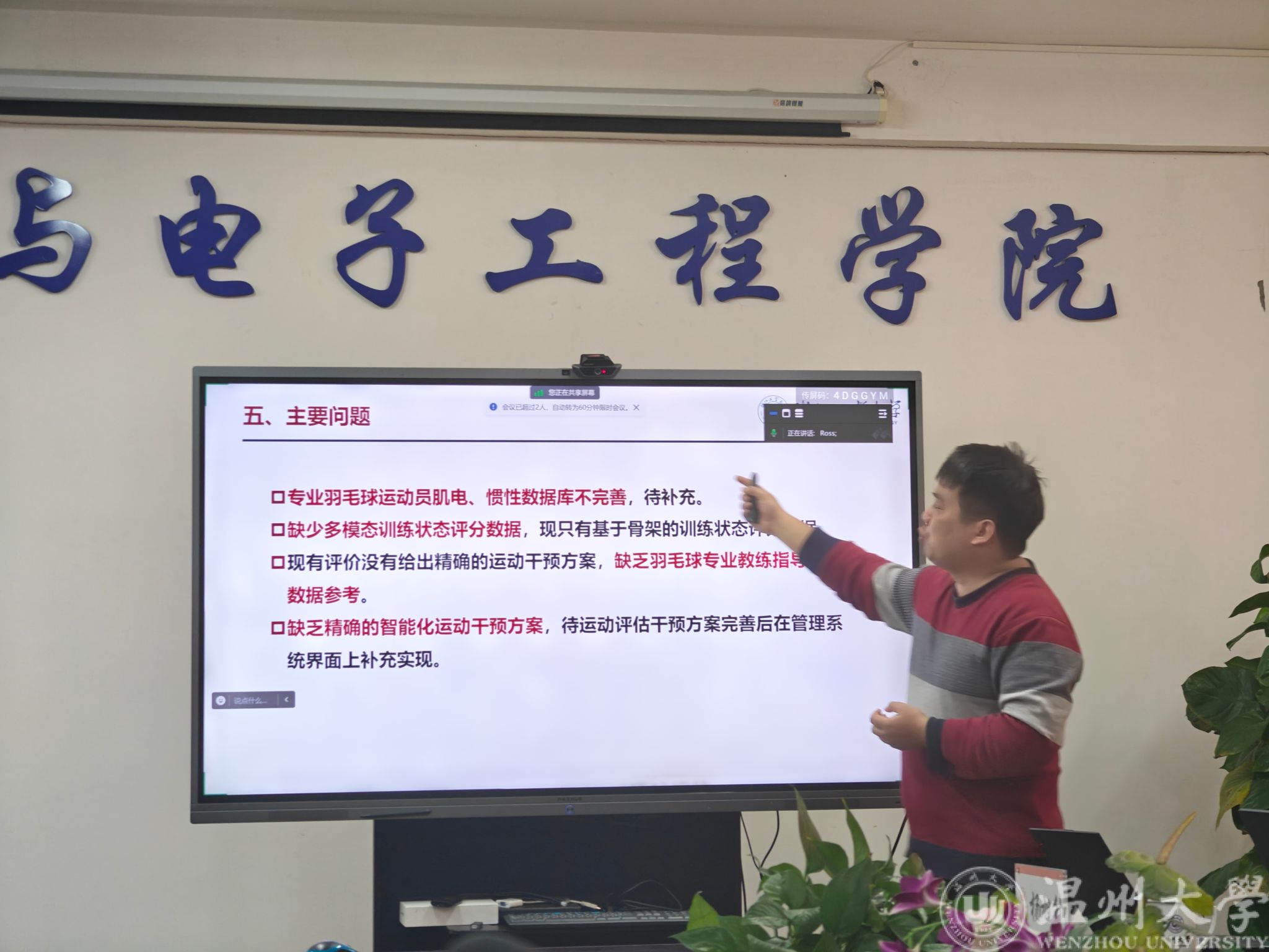 随后,王小航教授分享了在人工智能应用方面的最新研究成果和未来发展方向。杨旭升副教授作了关于浙江省“领雁”研发攻关计划项目“智能化精准运动能力检测与评估系统研制—竞技运动的智能融合检测和评估系统”的阶段性研究成果的报告。与会科研骨干和专家对羽毛球数据集采集、运动相关的预测算法的实施路径等相关议题进行了热烈的交流,也为我院人工智能应用领域科研发展带来了更多珍贵的启发。