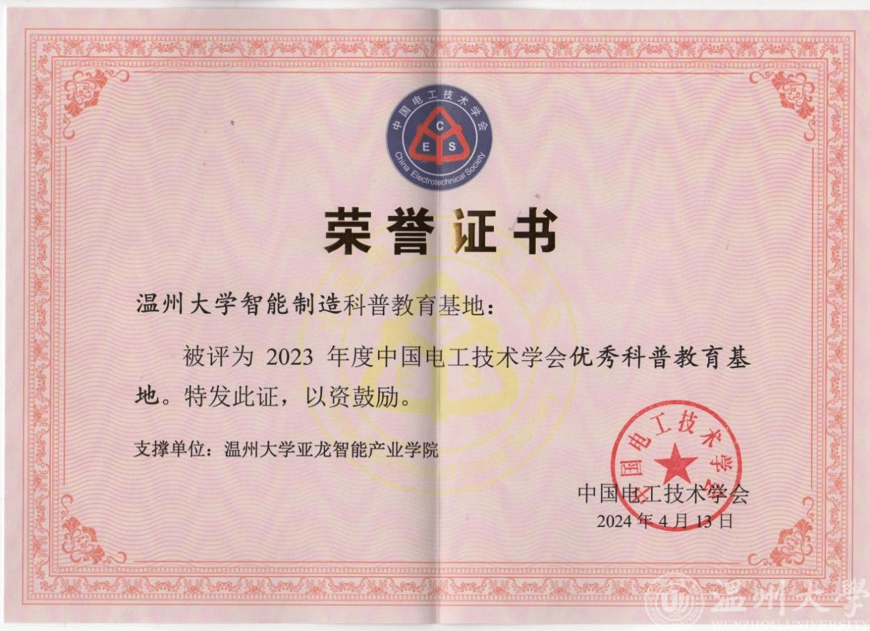 4月13日,中国电工电工技术学会对4家单位授予2023年度“中国电工技术学会优秀科普教育基地”称号。温州大学智能制造科普教育基地荣获此称号。