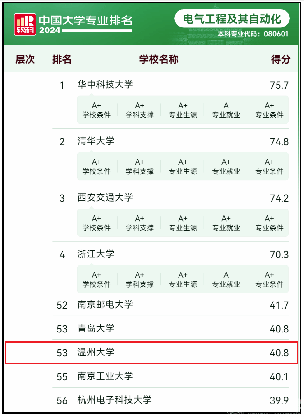 2024年6月13日,高等教育专业评价机构软科正式发布“2024软科中国大学专业排名”,排名包括810个专业,涉及93个专业类、12个专业门类。温州大学电气工程及其自动化专业排名从去年的73名跃升至今年的53名,浙江省同专业排名第2,仅次于浙江大学。