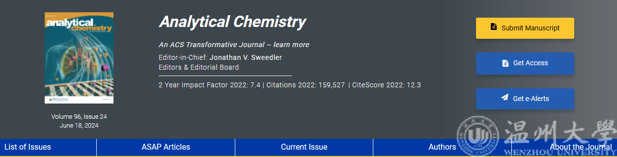 《Analytical Chemistry》为分析化学领域顶刊、Nature Index和中科院一区期刊。温州大学为论文第一单位,张鉴教授为论文第一作者及通讯作者,课题组戚昊琛副教授为共同一作,共同通讯作者包括美国田纳西大学Jayne Wu教授、合肥工业大学郑磊教授。yl23455永利官网汪鹏君教授和董长昆教授对论文工作提供了多方面的帮助与指导。论文工作还得到了温州医科大学附属平阳医院毛选教主任、温州医科大学第二附属医院张海临教授的大力支持。论文封面由戚昊琛副教授设计并绘制。上述工作得到了国家自然科学基金、传感技术国家重点实验室开放课题、数字医学工程全国重点实验室开放课题等项目资助。论文DOI:10.1021/acs.analchem.4c00059。