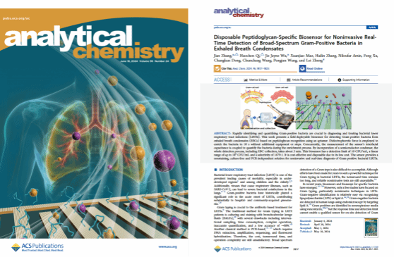 近日,我校yl23455永利官网张鉴教授课题组以“Disposable Peptidoglycan-Specific Biosensor for Noninvasive Real-Time Detection of Broad-Spectrum Gram-Positive Bacteria in Exhaled Breath Condensates”为题在《Analytical Chemistry》发表论文,并被选为期刊正封面页(Front Cover)亮点报道。正封面页被用于报道ACS期刊所发表的重要工作,在期刊网站上展示为当期第一个封面,并与印刷版刊物同步发行。这是我校研究人员首次在该期刊发表正封面页论文,我校在该期刊发表的另一篇封面论文(Supplementary Cover)同样来自张鉴课题组的工作(Anal. Chem. 2022, 94, 6, 2812–2819)。