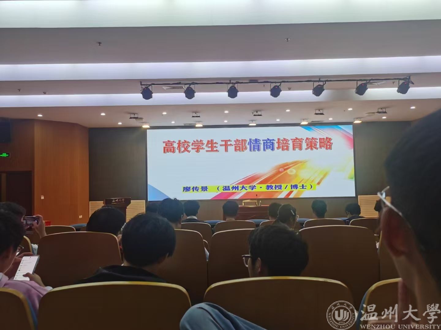 2024年11月4日晚18:30,我院大一全体学生干部在岩松堂步青厅开展本学期心理幸福课。本次课程由廖传景教授主讲,此次培训聚焦于一个至关重要却常被忽视的主题——学生干部的情商培育。廖老师以其深厚的学术底蕴和丰富的实践经验,生动诠释了情商在学生干部成长与发展中的不可替代作用。