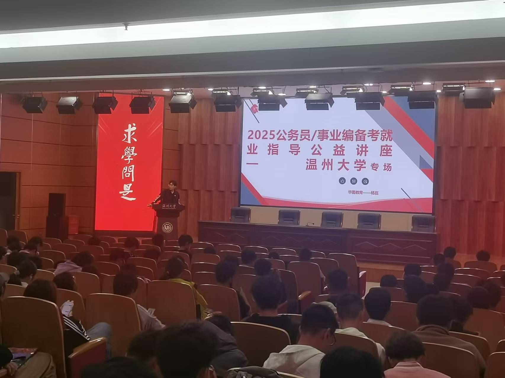 2024年11月7日,我院邀请了华图教育的资深讲师杨磊在岩松堂雁山厅为同学们带来了一场别开生面的公务员/事业编备考就业指导公益讲座。此次讲座旨在帮助同学们对考公考编有一个全面而深入的了解,为他们未来的职业规划提供有价值的参考。本次讲座吸引了我院近三百名学生参与。
