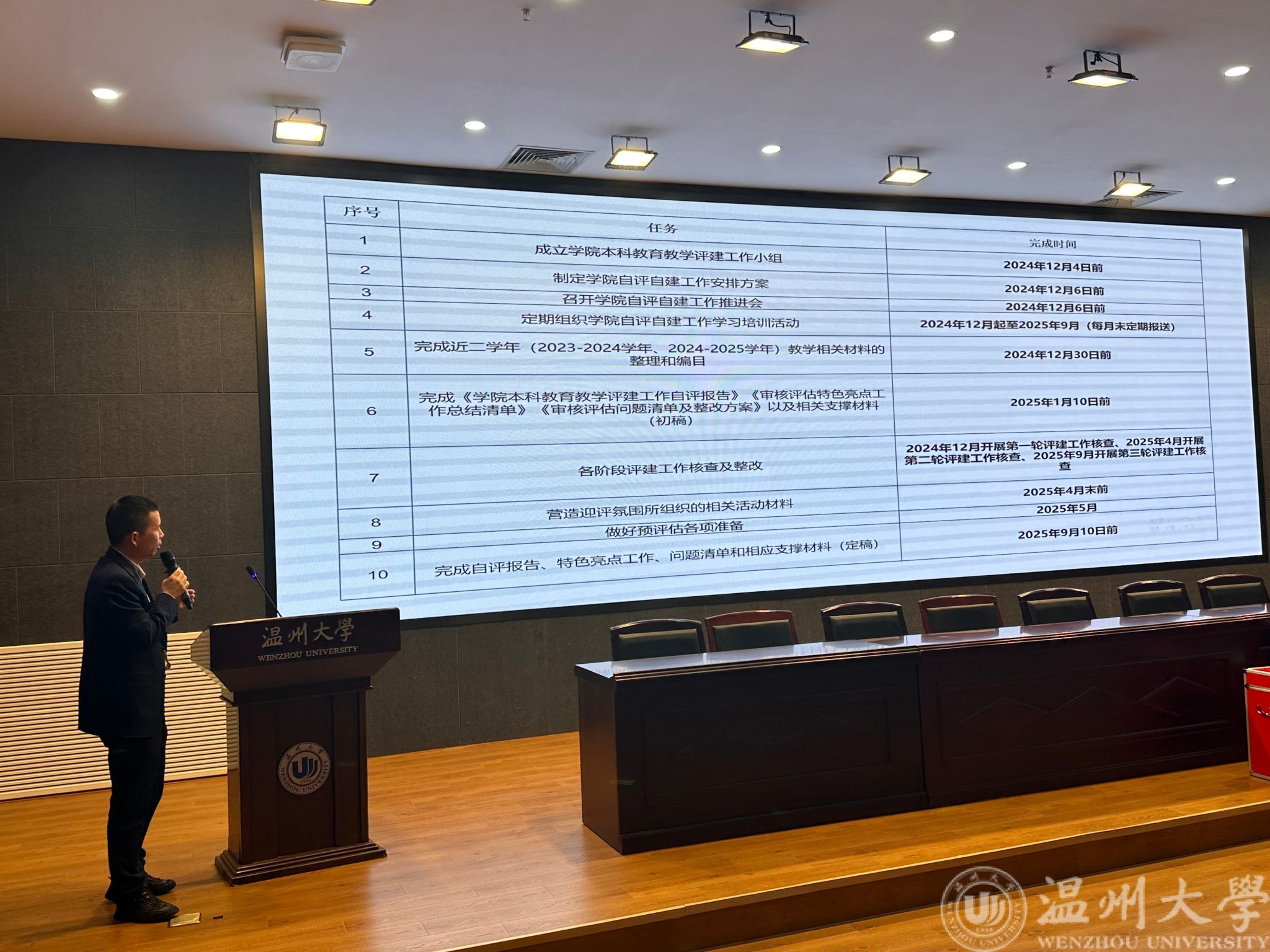 会上,陈孝敬副院长首先强调审核评估是对学院本科教育教学工作的又一次重要检验,全体师生要高度重视,凝聚共识,全力以赴;同时,他传达了学校本科教育教学审核评估评建工作推进会相关精神,并结合《温州大学本科教育教学审核评估实施方案与工作手册》,对学校下发的审核评估相关任务进行了详细解读和工作部署,内容包括:自评报告撰写、支撑材料建档、教学材料整理、管理文件编制等多个方面,他强调各系部、专业、科室对标《温州大学普通高等学校本科教育教学审核评估指标体系》要求,科学合理分解任务,严格按照时间节点落实,理清评估工作思路,强化迎评行动措施。