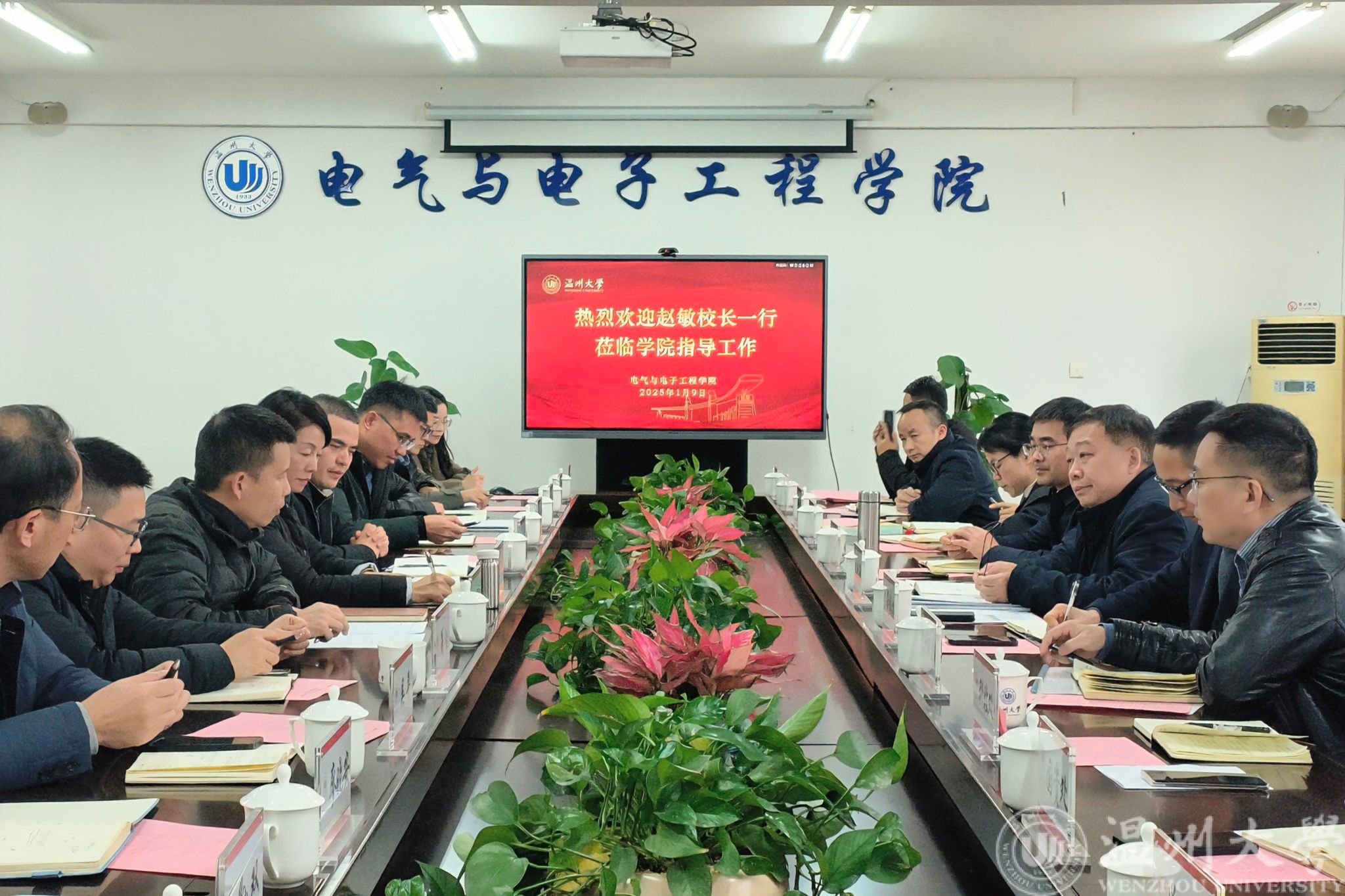 赵敏校长认真听取学院情况汇报后,对学院新班子锐意进取的工作作风给予了充分肯定。他认为,新班子各项工作开局良好,捷报频传,学院事业蒸蒸日上。他指出,yl23455永利官网有温州市重点打造的学科,与浙江省产业链接密切,学院要与企业政府开展深度合作,将科研优势转化为产业优势,为地方经济发展注入了强大的科技动力。他希望学院加强顶层规划,一是持续谋划博士点申报工作,全面剖析学科优势与特色,精准锚定申报方向,全力推进;二是聚焦学科建设,精准发力提升学科核心竞争力,冲刺一流;三是开源节流降本增效,优化资源配置,积极拓展校地合作项目,探索多元创收路径,激发学院建设发展新动能。
