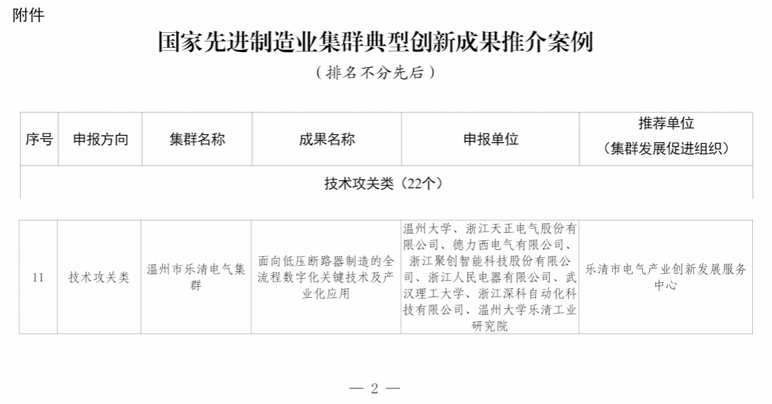 近日,工业和信息化部工业文化发展中心公布了国家先进制造业集群典型创新成果推介案例名单,由温州大学牵头,联合乐清市国家级先进制造业集群企业、武汉理工大学等单位共同技术攻关的成果“面向低压断路器制造的全流程数字化关键技术及产业化应用”入选技术攻关类典型案例。