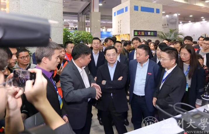 15日上午,浙江省委常委、温州市委书记陈伟俊,温州市委副书记、市长姚高员和浙江省人社厅副厅长金林贵等领导,分别在温州大学党委书记谢树华和校长赵敏的陪同下,巡查了学院的参展作品。当看到“低压电器数字制造孪生车间及系统”项目时,陈伟俊书记询问了项目的应用情况,并对项目目前已取得的产业化成果表示极大肯定,鼓励我院为更多的企业提供服务和帮助。姚高员市长对学院作品“低压电器数字制造孪生车间及系统”在浙江天正电气股份有限公司的产业化应用表示满意,并希望后面可以继续立足区域、服务企业,为服务地方经济做出更多贡献。谢书记和赵校长亲切慰问了我院参展的师生代表,并对我院在产业化成果推广、服务温州地区经济发展方面做出的成绩表示肯定。