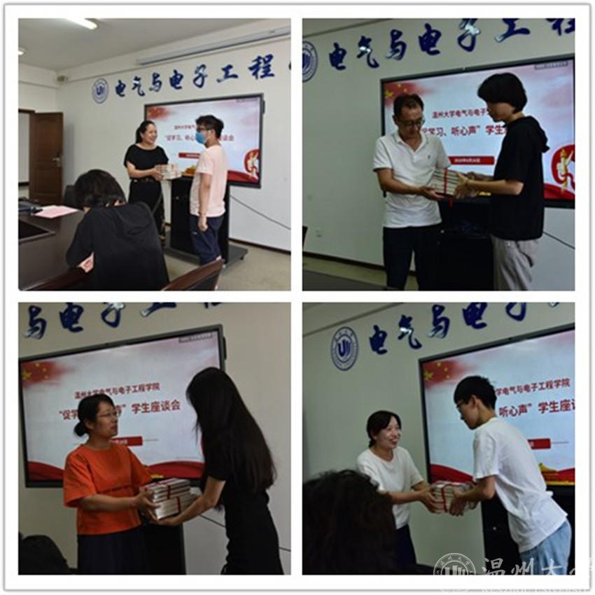 会议伊始,由教工支部组织委员潘龙飞逐一介绍与会各位党员和老师的基本情况。紧接着,参会的各年级学生代表逐一做自我介绍,并从疫情期间线上学习情况、返校之后的学习和生活状况、学分获得、重修课程等方面进行了自我反馈,参会的班干部代表还围绕着班级管理、学风建设、寝室生活等方面进行了面对面沟通和交流。会议过程中,院党委书记李方强就学生有关学习、学分、就业等问题做了交流,他语重心长的指出,学院有十几位行政老师,我们的任务就是负责服务大家的学习和成长,各位同学们在学校里不仅要和班主任、代课老师做好交流和沟通,也要和学院教学口、学工口的老师多沟通,希望大家能在学校里在完成好学业的同时,也要学会成长、学会做人。会议第三项,举行赠书仪式。会前教工行政支部给学生们精心购买了励志书籍,赠予他们,以此鼓励他们积极进取,顽强拼搏。
