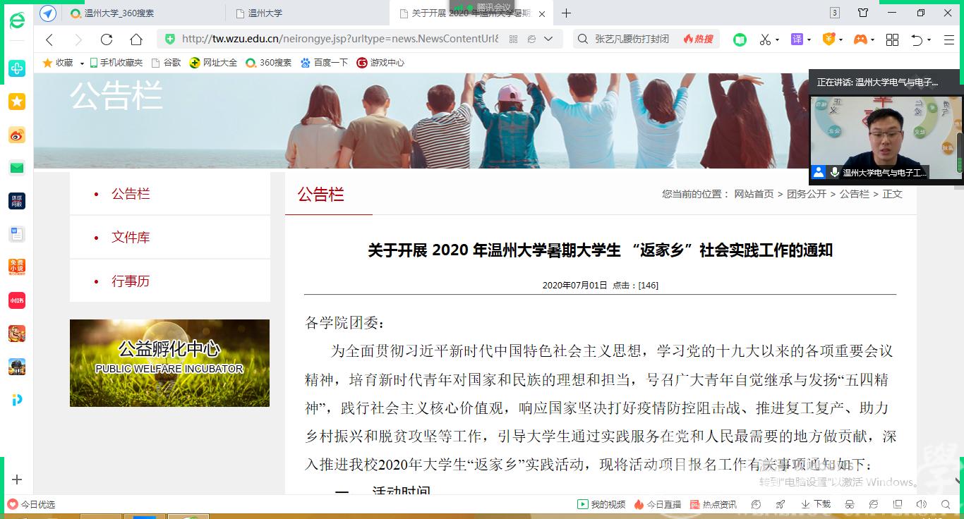 为进一步落实《关于开展2020年温州大学暑期大学生“返家乡”社会实践(“挑战杯”创新创业专项)工作的通知》要求,鼓励大学生暑假期间积极投身“返家乡”社会实践,7月5日下午14:00,我院召开2020年暑期大学生“返家乡”社会实践(“挑战杯”创新创业专项)工作线上答疑会。此次线上答疑会由我院负责团学工作的学工办辅导员潘龙飞老师组织,2019级全体本科生、部分未参加暑期社会实践的2018级、2017级本科生参加了此次会议。