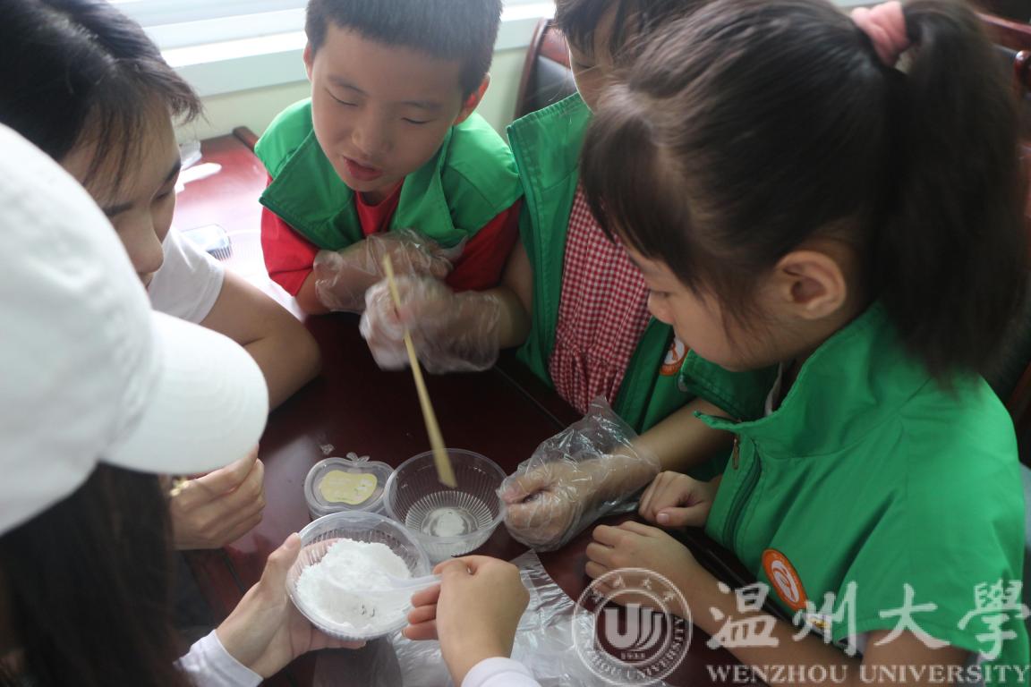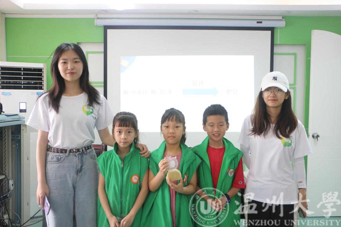 9:00,严肃而有趣的科普小课堂正式开始。实践队的成员们从废油入手,通过对废油以及由废油而引起的环境问题的介绍,让小朋友们认识到了身边废油污染环境而带来的严峻后果。在科普过程中,小朋友们积极思考,对废油环境污染问题提出了自己的见解。之后,实践队的成员们用事先准备好的仪器和材料亲自指导小朋友们如何利用废油制作肥皂。小朋友们个个跃跃欲试,怀揣着激动与好奇的心情正式开始了实验。在实验的过程中,成员们手把手地带领小朋友们一步步地进行操作。在实践队成员们耐心的指导下,一块块肥皂终于“出炉”。小朋友们拿着自己做的肥皂与成员们一起合影留念,结束了这短暂而有意义的一天。