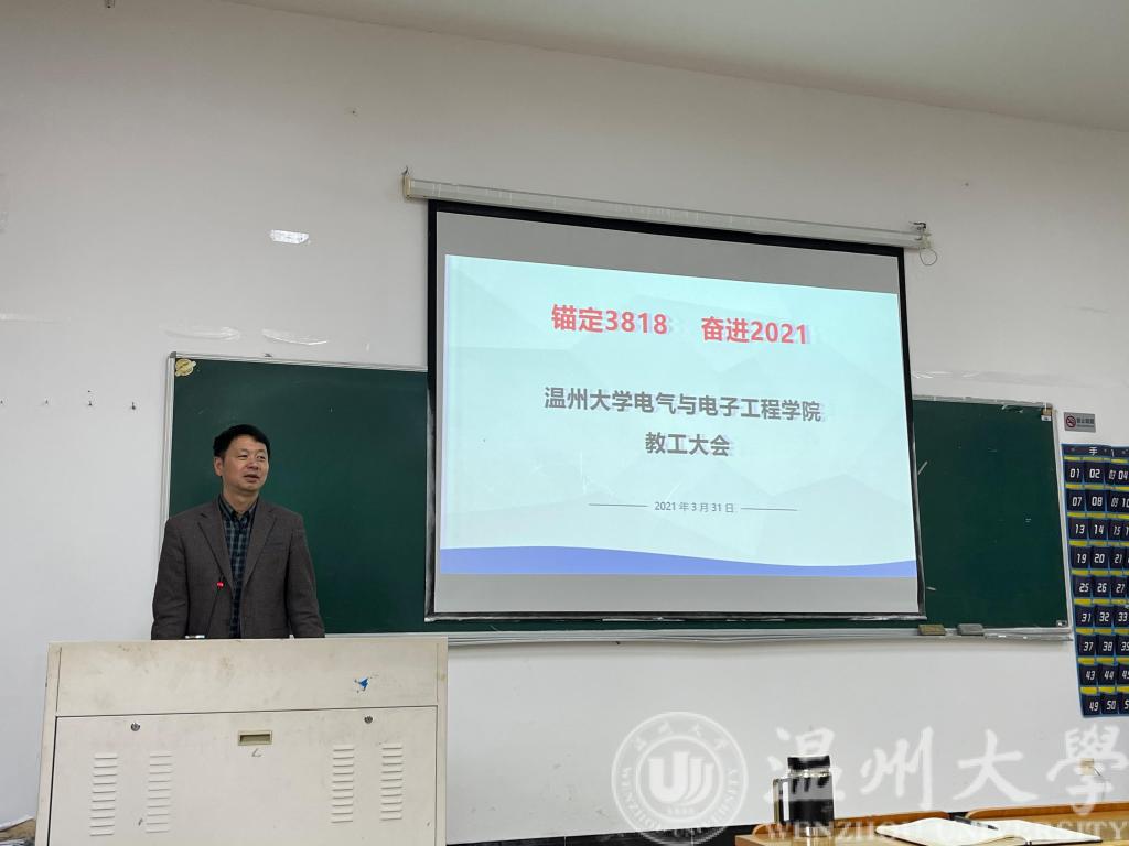 首先,院长汪鹏君对学院2020年工作进行总结并布署2021年工作。指出学院在人才培养、学科建设、科学研究、服务地方、师资队伍、党的组织建设等方面均取得显著成绩。完成I类重点突破性指标1项,超额完成II类重点竞争性指标4项,荣获温州大学考核优秀奖。同时分析了存在的问题和不足,如毕业论文质量有待提高、人才引进力度有待加大、培训管理有待规范等。针对学院目前在教学、学科竞赛、科研、团队建设、经费合理使用等方面工作做详细部署和安排。