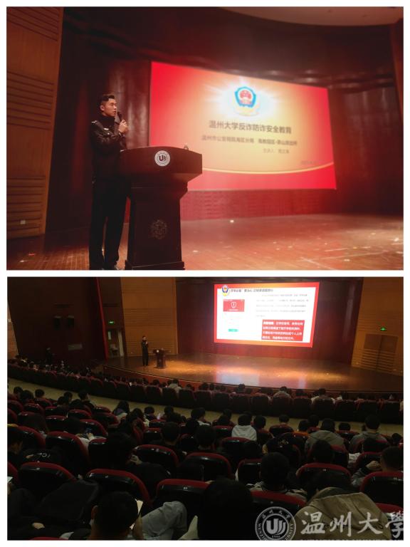 2021年4月14日下午,我院于南校音乐厅面向全体19级与20级学生举行了“反诈防诈网络安全教育”主题讲座。本次讲座邀请到了温州市公安局瓯海区分局高教园区茶山派出所的周文涛警官向同学们进行防诈反诈的安全教育。