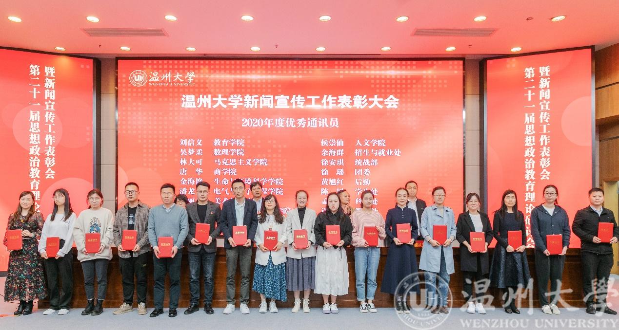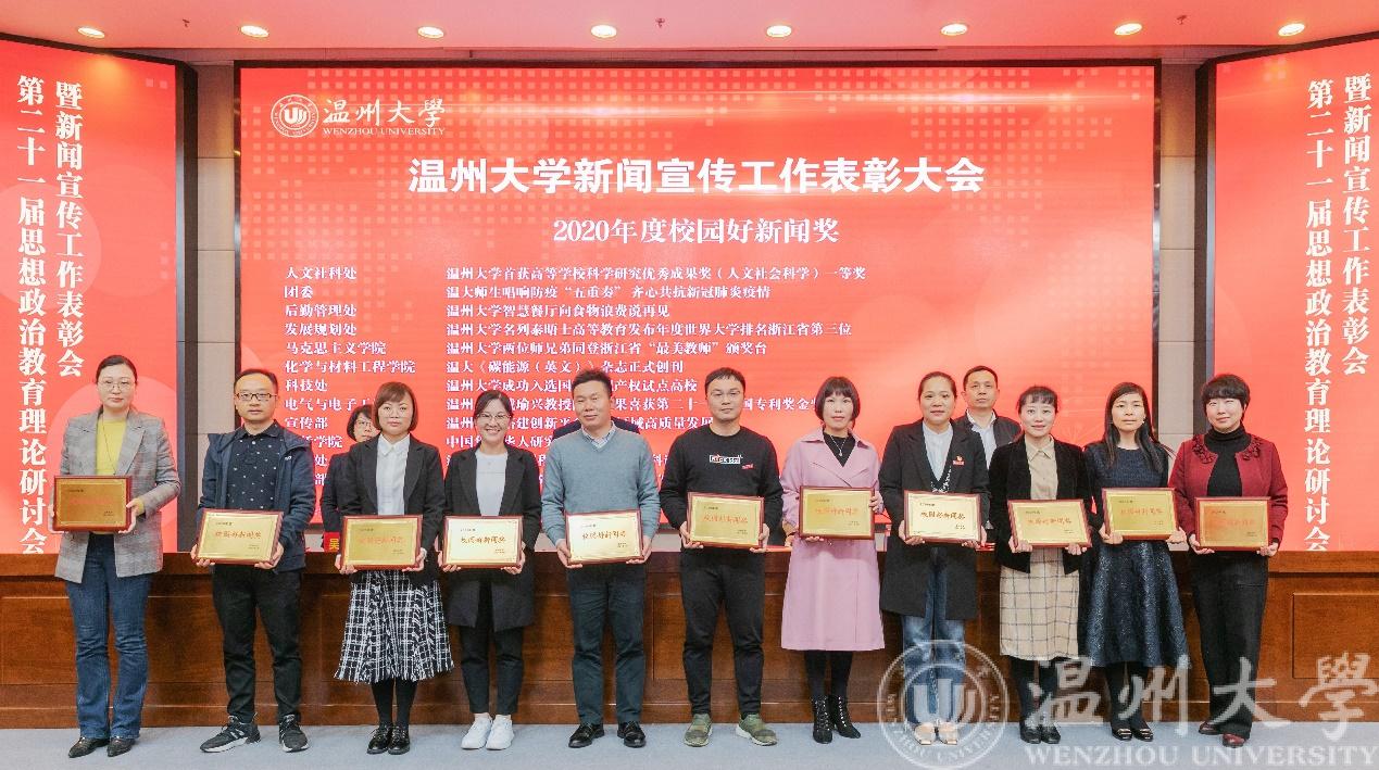 会上,温州大学党委委员、宣传部长潘玉驹宣读了学校第二十一届思想政治教育理论研讨会优秀论文获奖者、2020年度校园好新闻获奖单位、校优秀通讯员获奖者以及全省校报好新闻获奖者等名单。yl23455永利官网戴瑜兴教授团队科研成果报道:《温州大学戴瑜兴教授团队成果获第二十一届中国专利奖金奖》荣获校园好新闻奖,我院学生科辅导员潘龙飞获得2020年校优秀通讯员称号。