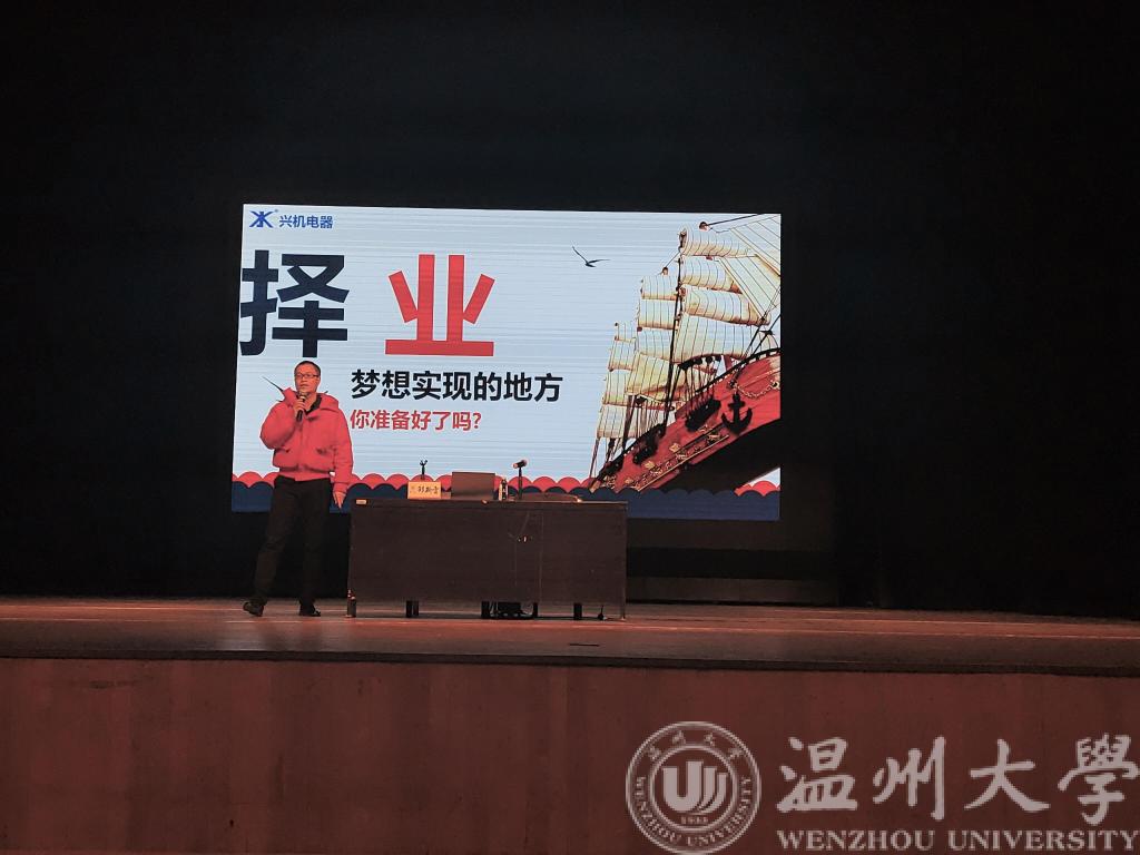 紧接着,由兴机电器公司的人事部负责人邵新雷老师带来了他关于择业和大学生职业规划的讲座。关于择业时“去哪里工作这个问题?”,邵新雷老师就天时、地利、人和三方面进行分析,“大型企业看文化,中型企业看行业,小型企业看老板”的原则,从行业前景、当下需求、企业状况、交通情况、离家路程等方面给学生提出了参考建议。