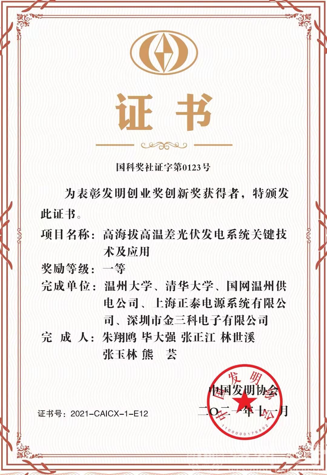 12月12日,中国发明协会发明创业奖·创新奖颁奖典礼在广东佛山举行。我院朱翔鸥教授领衔的“高海拔高温差光伏发电系统关键技术及应用”项目获“2021年度发明创业奖•创新奖”一等奖。