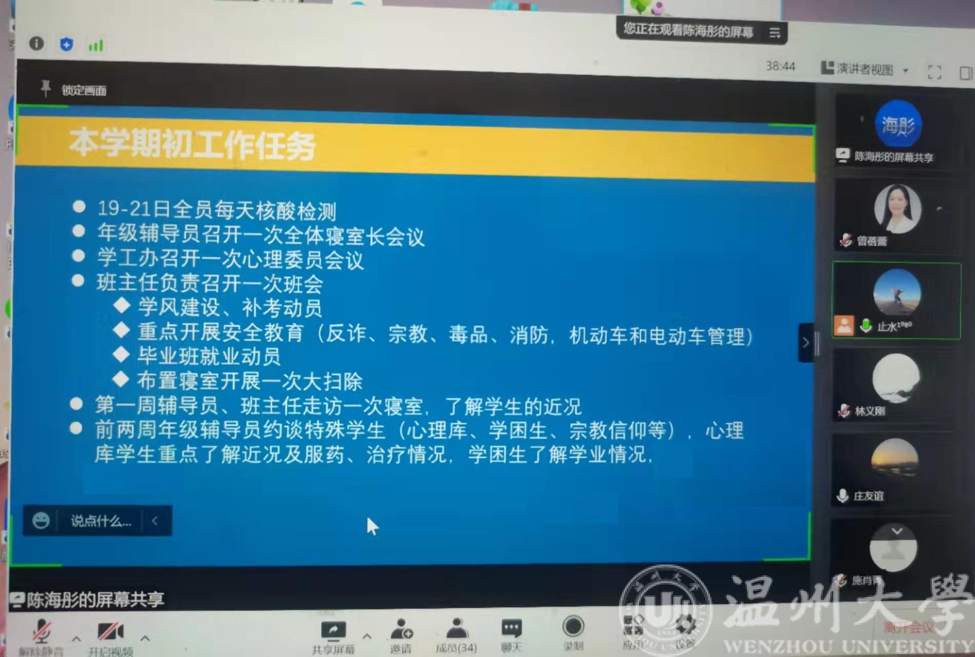2月21日下午,我院召开线上2021-2022学年度第二学期第一次全体班主任会议,会上学院党委副书记曾蓓蕾传达了学校疫情防控工作会议的主题精神,就第一周线上教学及生活区相对封闭管理等做了详细说明,重点强调了新学期组织引导学生开展宗教知识的学习活动。会上,学工办主任廖晓安老师还围绕《宗教工作知识手册》相关内容进行了安排说明。