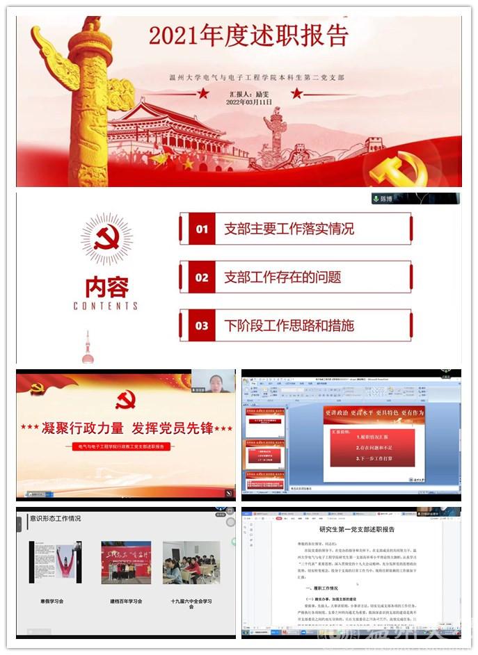 首先,由学院全体师生党支部书记作2021年度支部党建工作报告。我院电气系、电子系、低压电器平台、行政教工、智能锁具研究院党支部,本科生第一、二党支部,研究生第一、二党支部,共九个党支部书记依次作述职报告,汇报了2021年支部党员发展、理论学习和活动开展等情况,深入剖析支部工作中存在的问题,以及2022年支部工作改进要点和方案。
