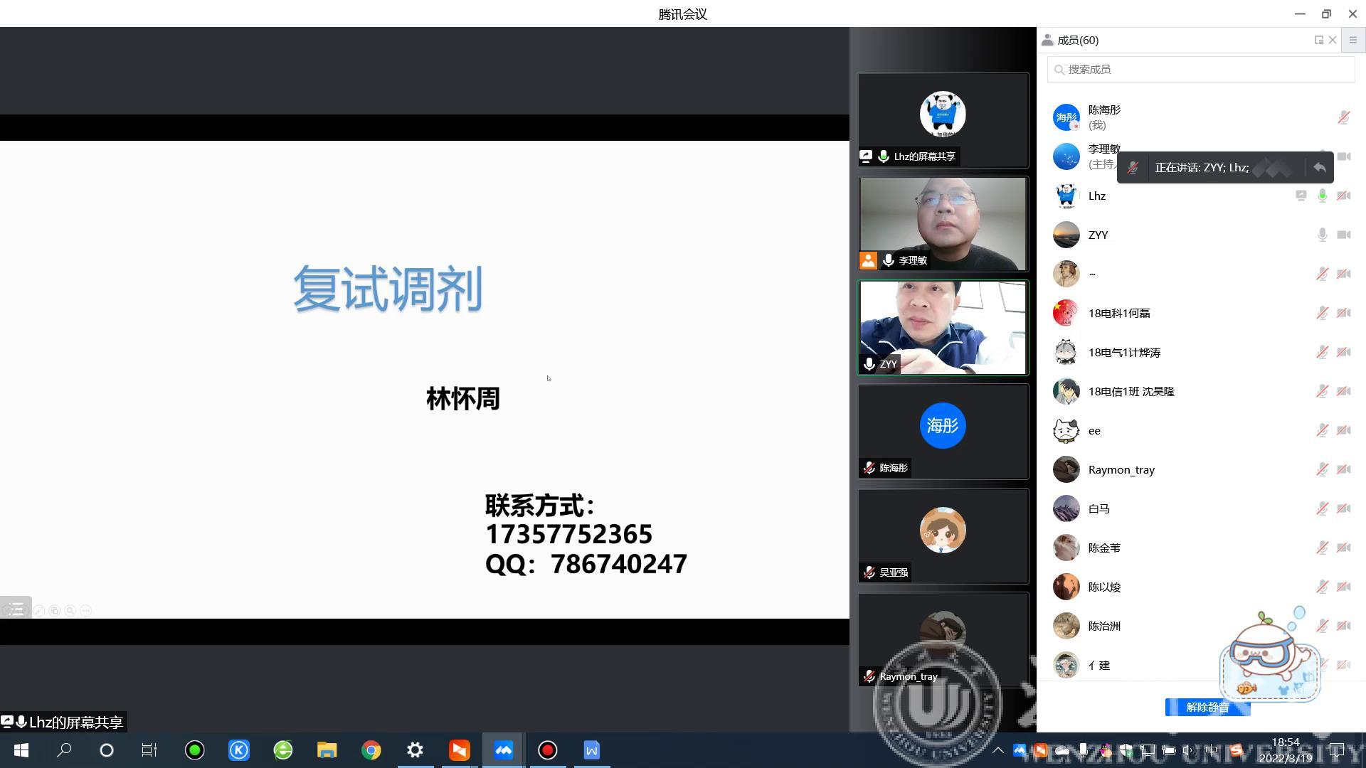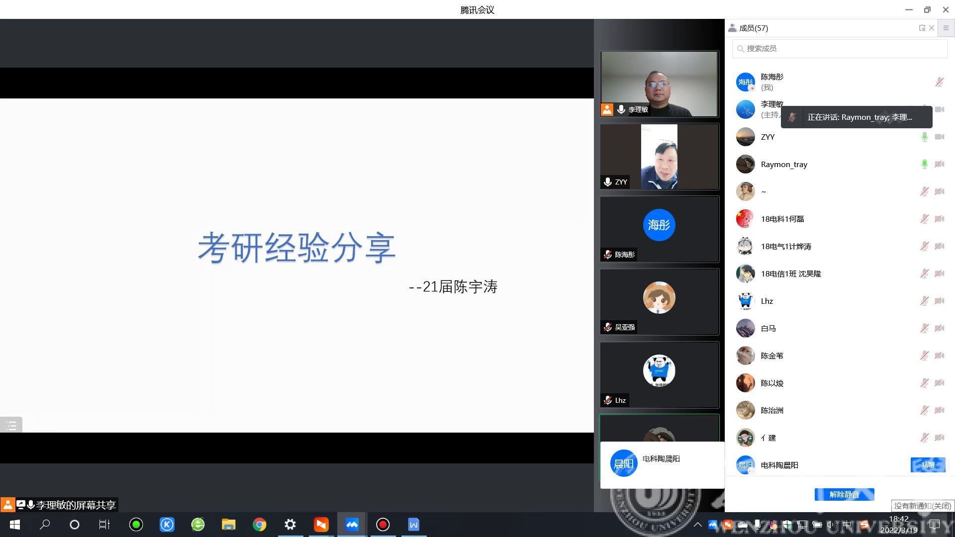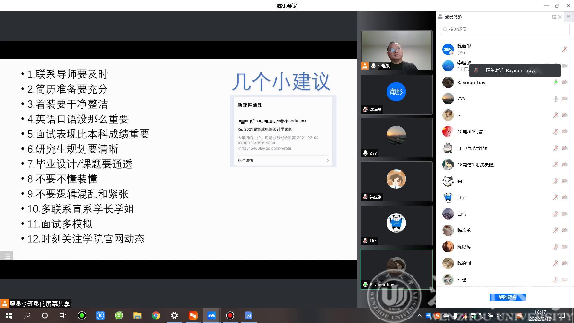 为进一步助力2022年考研学子顺利上岸,打通研途最后一公里,3月19日晚上18:30,我院在线上举行了2022年考研复试及调剂经验分享会。本次分享会分别邀请到目前就读于浙江大学的陈宇涛同学以及桂林电子科技大学的林怀周同学为大家进行考研复试及调剂经验分享。会议由学院电子系主任李理敏老师和庄友谊老师主持,2018级班主任和2022年考研学子参加了此次分享会。
