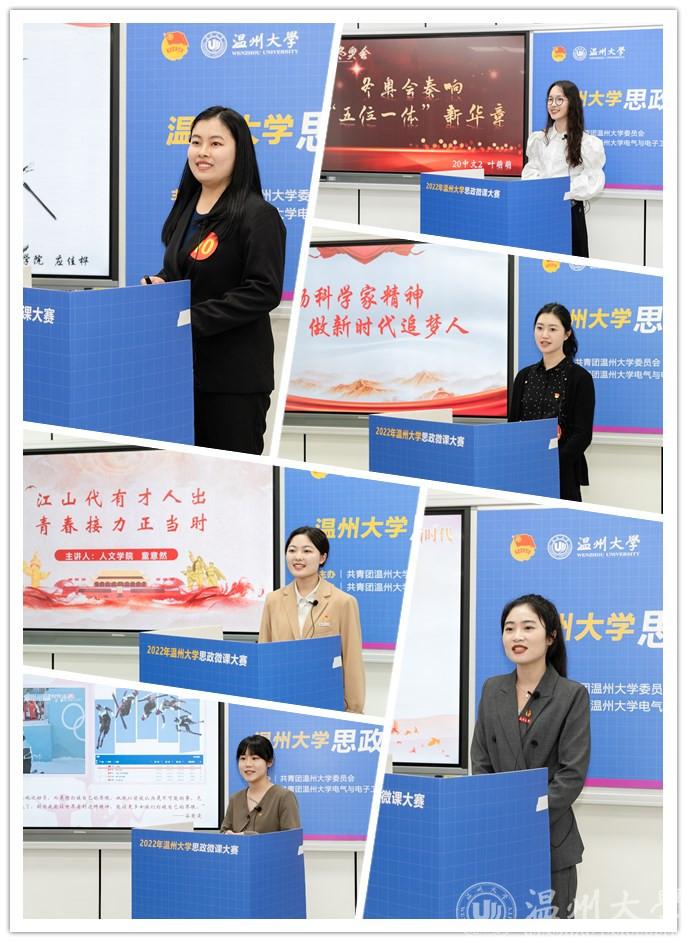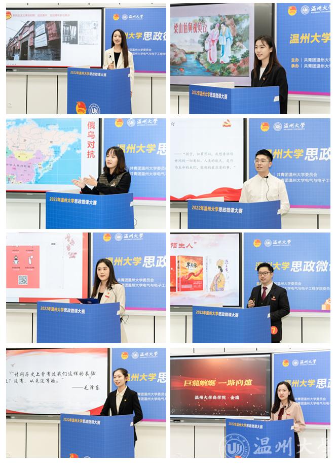为全面贯彻落实习近平总书记在学校思想政治理论课教师座谈会上的重要讲话精神,贯彻落实中央、省委关于深化学校思政课改革创新的部署要求,创新打造全链条的思政育人新体系,进一步强化对全校青年的政治引领和价值引领,唱响主旋律、弘扬正能量、传播好声音。我校于3月举办了温州大学2022年度“百年青春心向党,矢志建功向未来” 思政微课大赛,大赛重点围绕庆祝中国共产党成立100周年, 讴歌党带领人民进行的伟大斗争、伟大创造,深刻反映党的伟大精神的历史轨迹和现实力量,生动讲好建党百年辉煌历程中的奋斗故事。