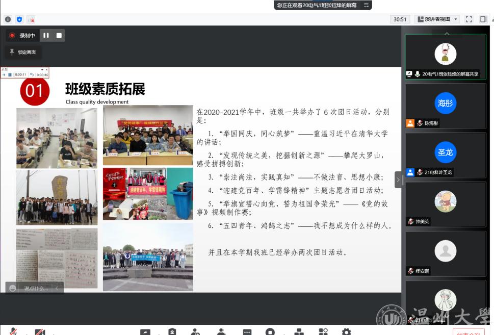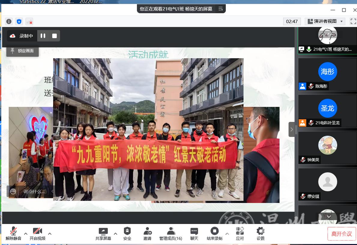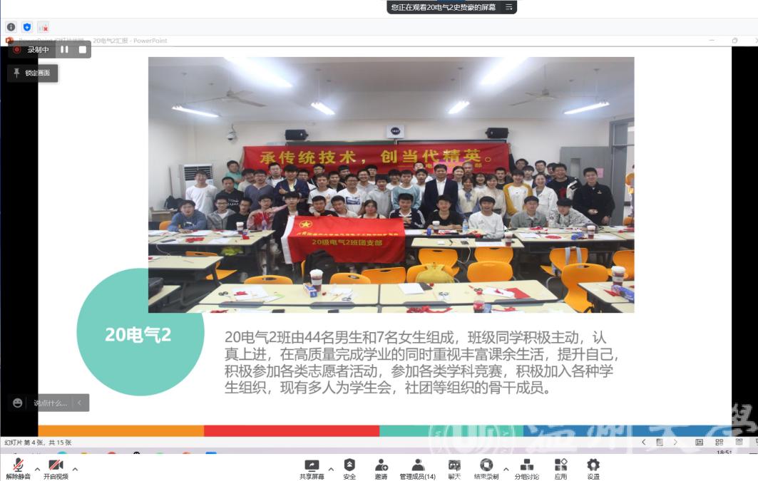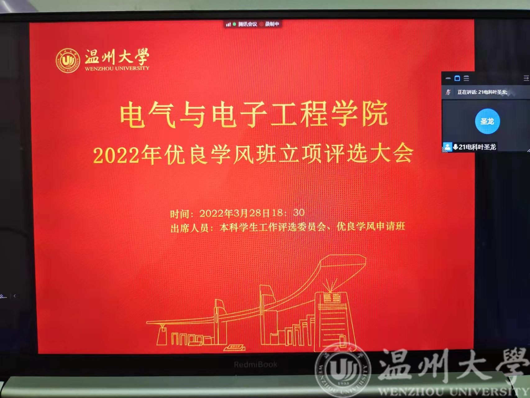 为进一步加强校风学风建设,树立优良学风,加大优秀班级的示范作用,我院于2022年3月28日晚在线上举办“优良学风班”立项申请评选活动。学院本科生评选委员会委员以及申请立项的8个班级出席了本次活动。