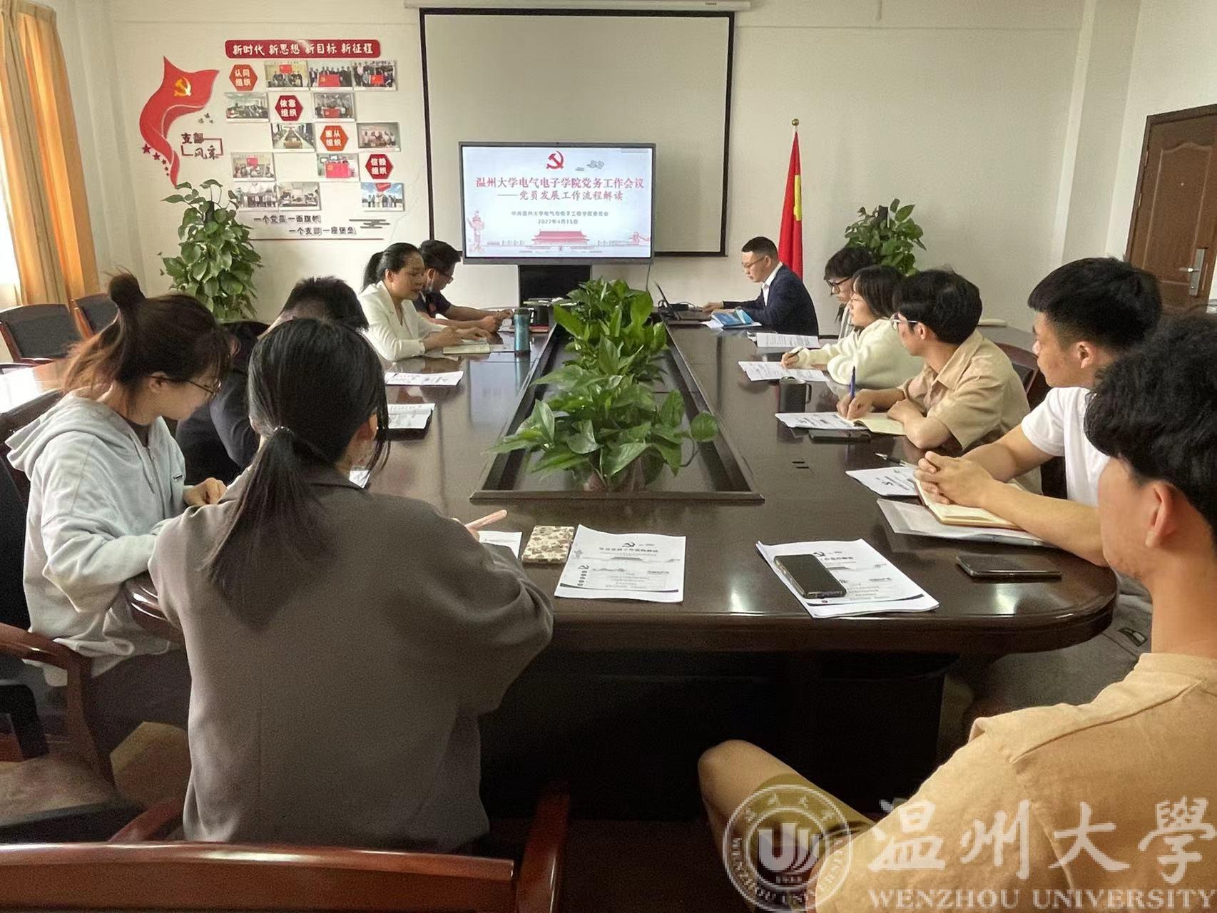 紧接着,学院党建负责辅导员潘龙飞,就党员发展工作流程做了解读,重点围绕申请入党、入党积极分子的确定和培养考察、发展对象的确定和考察、预备党员的接收、预备党员的教育考察和转正五个方面详细做了解读,特别是涉及到的重要时间节点向与会支委和党服干部做了说明。培训结束之后,与会成员就我院党务工作和党员发展相关注意事项进行了意见交流。