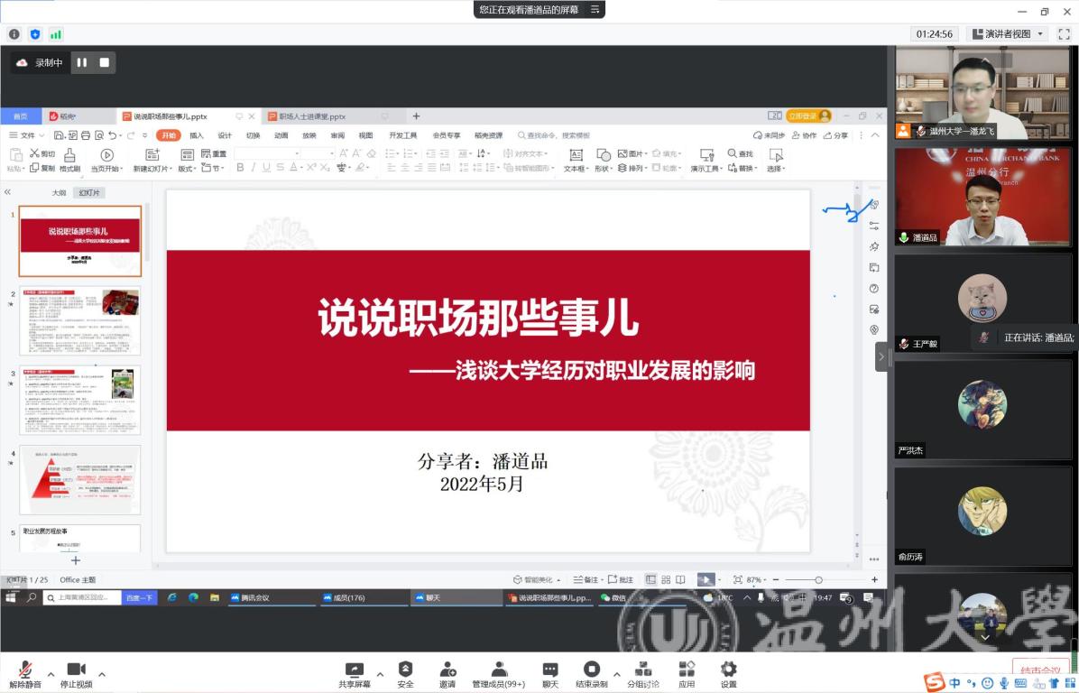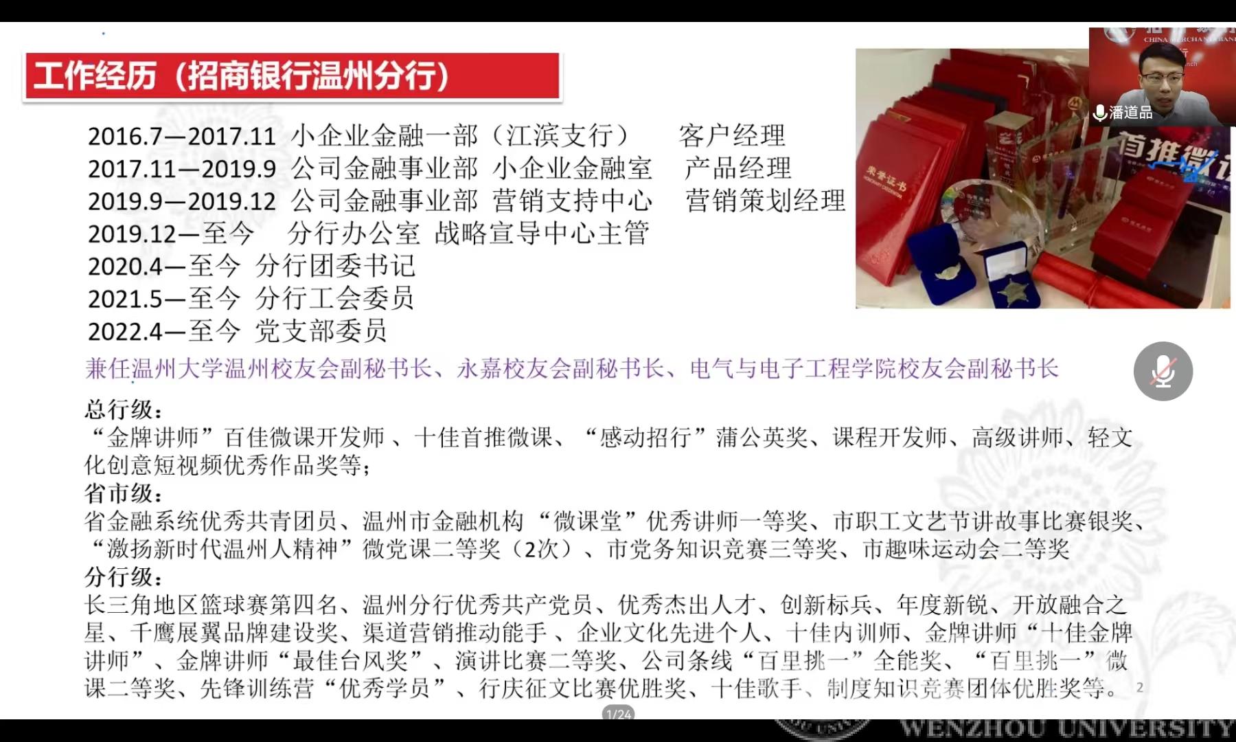 2022年校友节到来之际,为帮助学生明晰职业选择,做好职业规划,助力学生自主择业、理性就业,2022年5月11日晚上18:30,我院邀请到了2016届校友潘道品,为我院本科生开展线上讲座。此次讲座由我院辅导员潘龙飞主持,近200位学生参加了线上分享会。