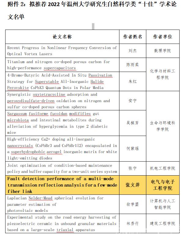 近期,2022年温州大学研究生“双十佳”学术论文评选结果公布,我院19级电气工程研究生张文萍同学的学术论文《Fault detection performance of a multi-mode transmission reflection analysis for a few-mode fiber link》获评自然科学类“十佳”学术论文。